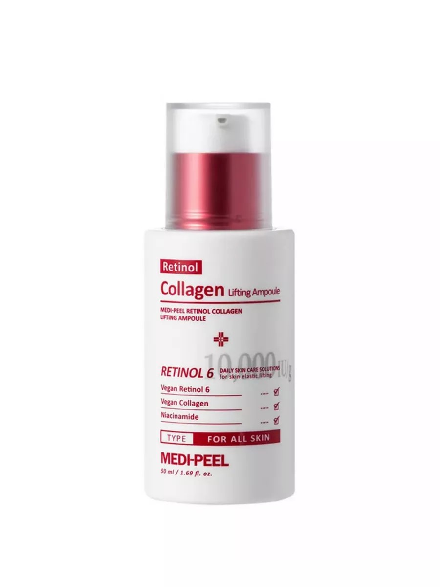 Medipeel Retinol Collagen Lifting Ampoule is an intensive concentrate of proven active ingredients that lift and smooth the skin, reduce the depth of wrinkles, tighten enlarged pores, and even out microrelief.
