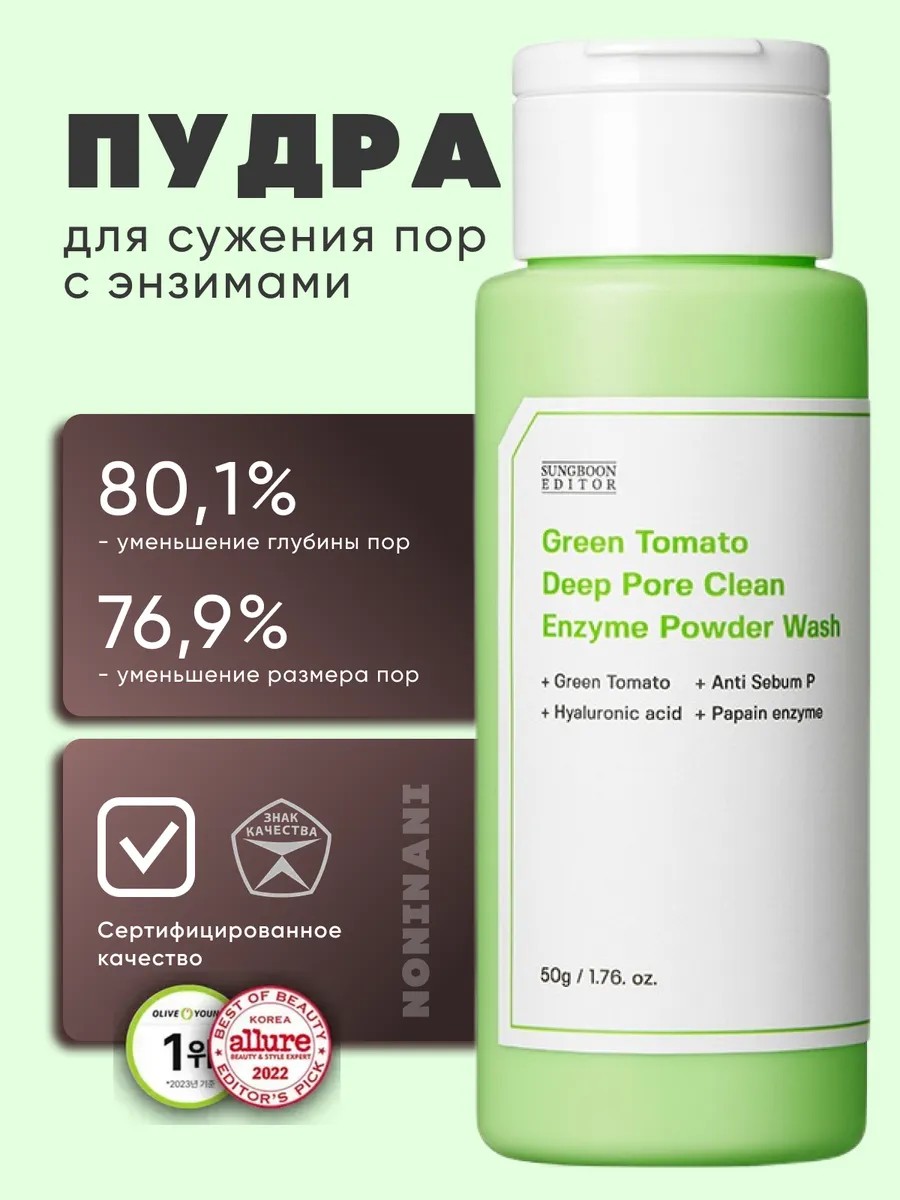 Энзимная пудра для глубокого очищения и сужения пор SUNGBOON EDITOR Green Tomato Deep Pore Clean Enzyme Powder Wash в отличии от классических пилингов и скрабов действует более мягко, деликатно отшелушивает ороговевший слой эпидермиса, удаляет все загрязнения, омертвевшие клетки и излишки кожного сала. Эффективно очищает поры, растворяет жировые пробки и способствует избавлению от чёрных точек.