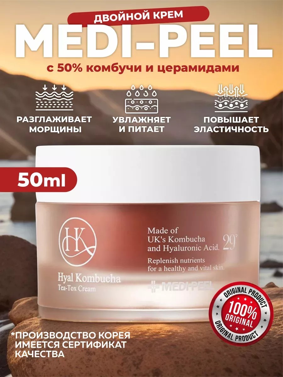 Dual cream Medi-Peel Hyal Kombucha Tea-Tox Cream restores, moisturizes and nourishes the skin, reduces the appearance of wrinkles, adds elasticity and density.