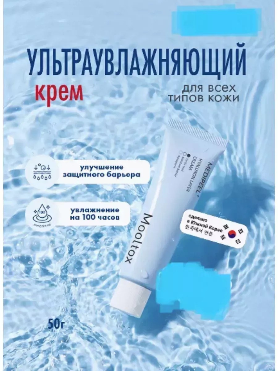 Medi-Peel Hyaluronic Acid Layer Mooltox Cream, an ultra-moisturizing aqua cream for dryness, provides deep and long-lasting hydration for up to 100 hours, softens and restores skin, and prevents irritation and flaking. It smoothes skin texture and prevents shine caused by dehydration. It strengthens the moisture barrier, relieves irritation, and maintains firmness and elasticity. Contains volufilin, squalane, niacinamide, ectoine, collagen, ceramides, neem tree, centella and gardenia extracts, sunflower and rice bran oils. Directions: After cleansing, toning, and using serum, apply the cream to your face and smooth it over your skin.