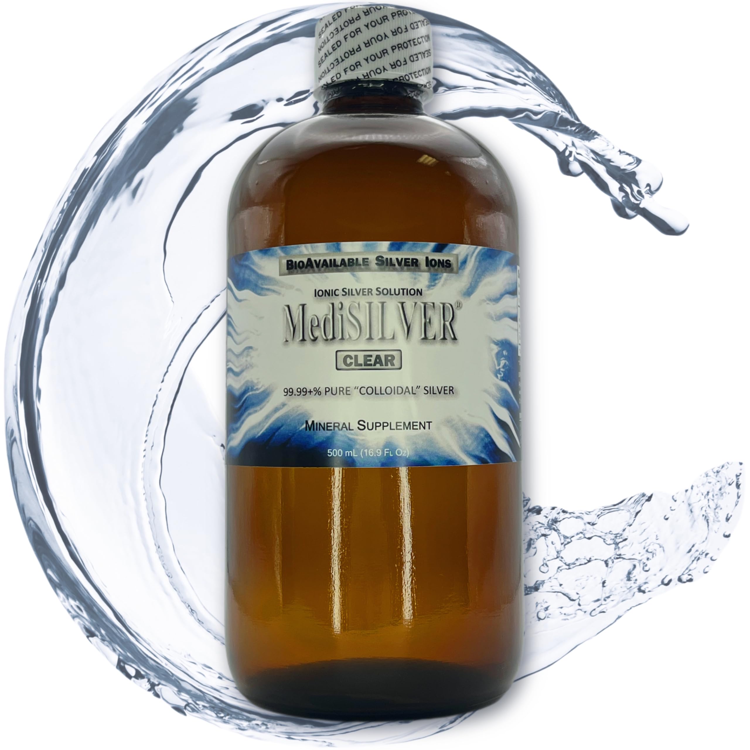 MediSILVER CLEAR consists free Silver ions (Ag ) dissolved in pure pharmaceutical grade water it is a slightly bitter-metallic, odorless, clear liquid. MediSILVER CLEAR is not a colloidal Silver, but is a free-ionic Silver solution where the free Silver ions are dissolved and dispersed in water rather than colloidally suspended. The free Silver ions in MediSILVER CLEAR are made from 99.99 pure Silver. MediSILVER CLEAR contains no Silver salts, no added color, no preservatives, and no stabilizers. The free Silver ions in MediSILVER CLEAR are, by definition, only one Silver atom in size and are 100 bioavailable. MediSILVER CLEAR is perfectly safe to consume daily in perpetuity as a dietary Silver nutritional supplement when taken as directed, or can be used topically. This is 500 mL (16.9 Fl Oz) of MediSILVER CLEAR True Free-Ionic Silver in an amber glass bottle - sealed for your protection.You are purchg 500 mL (16.9 Fl Oz) of MediSILVER CLEAR True Free Ionic Silver in an amber glass bottle sealed for your protection. Made in the USA Fair Trade Vegan Halal Kosher Cruelty-Free Keto Gluten free Alcohol free Sugar free, Hypo-Allergenic, Sodium free and GMO free. No added color, no chemicals, no preservatives, no stabilizers contains only 99.99 pure Silver and pure water. Safe 20 ppm of 100 bio-available 99.99 pure free ionic Silver nutritional supplement. MediSILVER Clear utilizes the proven power of 99.99 pure free ionic silver in a formula developed and perfected by our Biochemist and former NASA scientist our satisfied customers can be found in the USA, Canada, Mexico, Australia, England, Ireland, Italy, Spain, Brazil, Scotland, China, Hong Kong, Thailand, Croatia, the Philippines, Singapore, Taiwan, S. Korea, Japan, New Zealand, Germany, United Arab Emirates, Turkey, Saudi Arabia, and elsewhere.