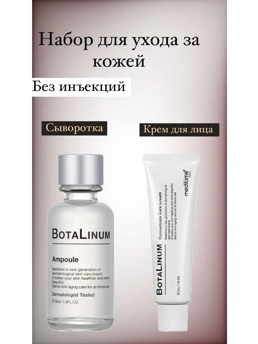 Крем восполняет недостаток коллагена в возрастной коже, активизирует обмен веществ в тканях, повышает их упругость и эластичность, с помощью волюфилина растительного устраняет провисание покровов и уменьшает глубину морщин. Состав усилен экстрактом центеллы для успокаивающего и восстанавливающего воздействия, пептидами и витаминами, усиливающими эффект омоложения и подтяжки.Лифтинг-ампула с ботулином Meditime Botalinum Ampoule направлена на омоложение кожи, она подтягивает ее, борется с дряблостью, формирует четкий овал, делает кожу упругой и свежей, увлажняет и питает ее. В состав входит запатентованный компонент ботулин, который создает эффект подтянутости , он блокирует передачу нервных импульсов к мышцам и тем самым сокращает мимические морщины. Волюфилин в составе помогает накопить липиды в тех зонах, где есть их недостаток, устраняет провисание, повышает упругость кожи, делает ее наполненной.