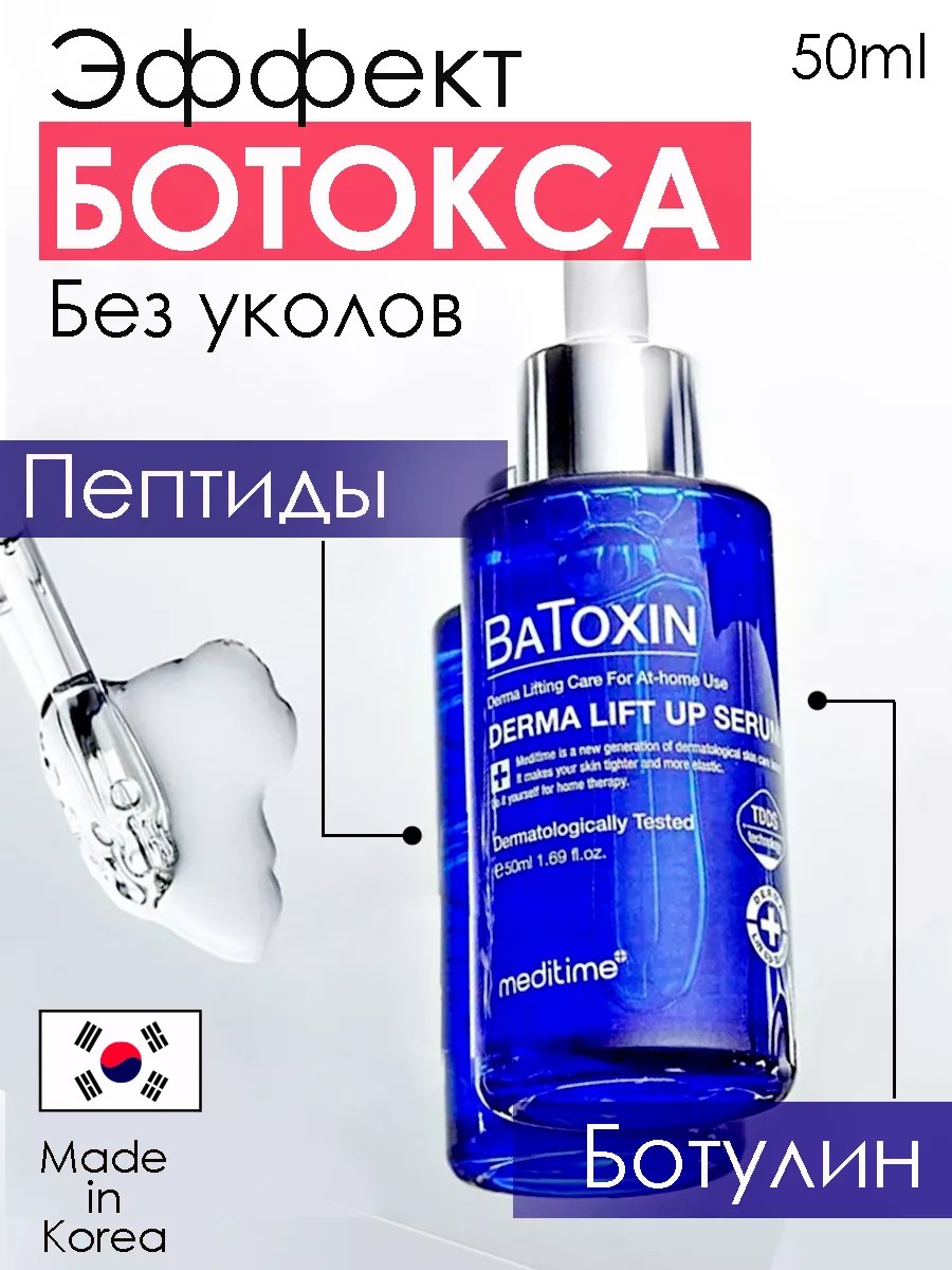 Сыворотка для лица с эффект ботокса! Meditime Batoxin Derma Lift Up serum профессиональный салонный уход на каждый день. Сыворотка для лица антивозрастная корея содержит активные компоненты ботулиновые пептиды, которые благодаря запатентованной технологии TDDS проникают глубоко в эпидермис и дарят молодость, здоровый тон. Лифтинг сыворотка с пептидами и ботулином MEDITIME Batoxin Derma Lift Up Serum обладает выраженным антивозрастным действием, разглаживает морщины, устраняет дряблость, подтягивает овал лица.