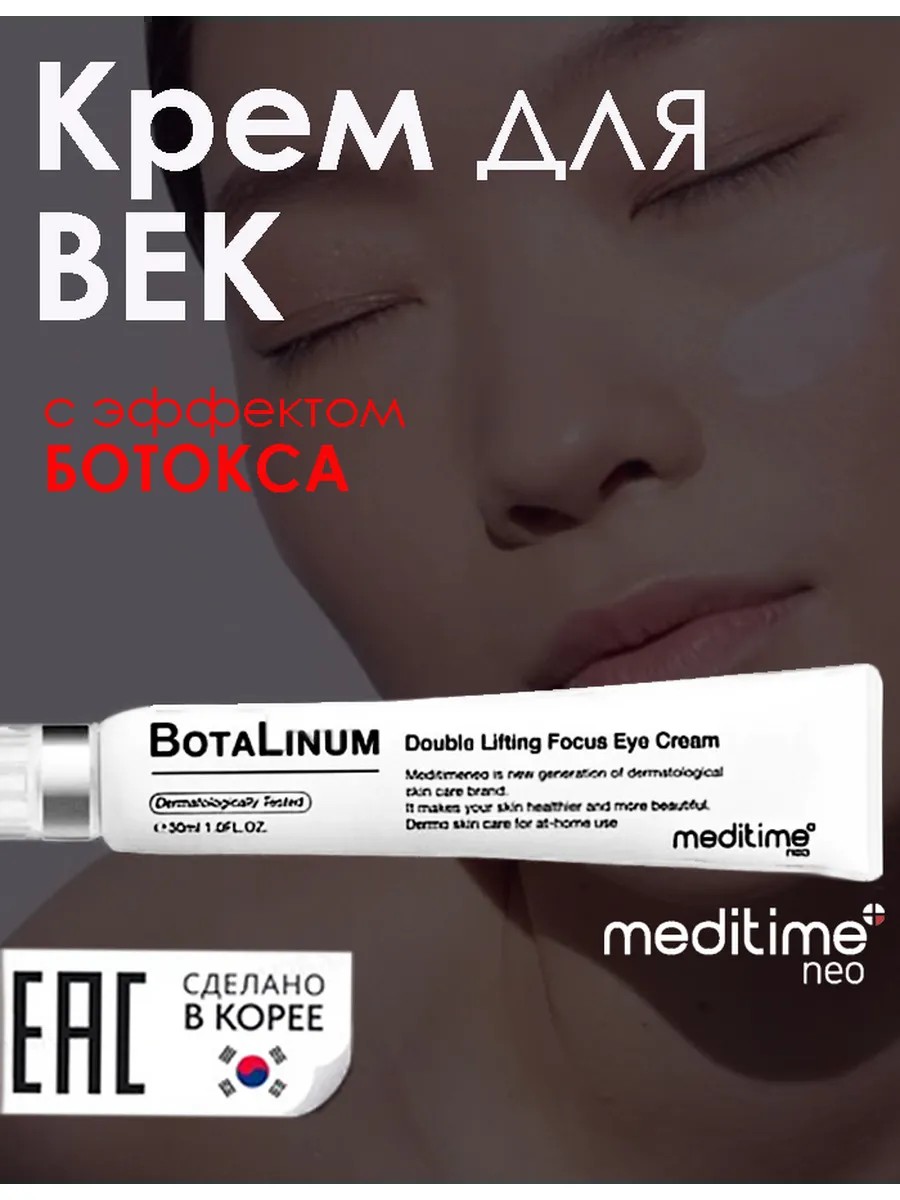 Крем для век с эффектом ботокса Meditime Botalinum Double Lifting Focus Eye Creamразглаживает кожные заломы и сокращает глубину мимических морщин. Питает и уплотняет тонкую кожу в области вокруг глаз, укрепляет и восстанавливает липидный барьер. Содержит комплекс пептидов, волюфилин, аденозин и гидролизованный коллаген. Избавляет от отеков и мешков под глазами, оказывает эффект против морщин и активизирует выработку коллагена. Крем для глаз тонизирует кожу и действует от темных кругов под глазами, стирая следы усталости. Тонкая кожа в области вокруг глаз нуждается в специальном уходе, чтобы предотвратить морщинки и тусклый цвет: средство помогает от синяков под глазами, улучшает цвет кожи и предотвращает возрастные изменения. Омолаживающий крем для век от морщин разглаживает гусиные лапки, подтягивает опущенное веко и уменьшает глубину заломов.Средство разработано по стандартам Кореи. Способ применения: легкими похлопывающими движениями нанесите корейский крем на очищенную кожу вокруг глаз. Невесомая текстура быстро впитывается и не оставляет ощущения липкости.