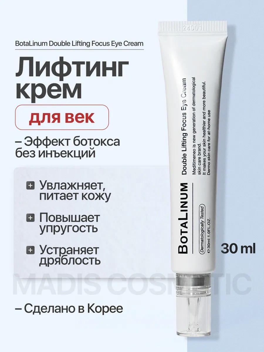 Botulinum Double Lifting Focus Eye Cream, a lifting eye cream with botulinum and a Botox effect, moisturizes and nourishes the skin, smoothes expression lines, restores tone, and tightens the skin. It contains the patented component botulinum, which creates a Botox-like effect by blocking the transmission of nerve impulses to muscles, thereby reducing wrinkles. Volufilin replenishes lipids in the skin, firms it, and improves elasticity. A peptide complex reduces wrinkles, prevents the formation of new ones, and provides a lifting effect. Fucus extract is a brown macroalgae that regenerates and restores the skin, possessing rejuvenating properties. Niacinamide brightens the skin, combats pigmentation and post-acne. It strengthens the hydrolipidic mantle and has anti-couperose properties. A peptide complex addresses photodamaged skin, hyperpigmentation, relaxes muscles, remodels facial contours, treats ptosis, rejuvenates, combats signs of aging, and regenerates and heals the skin.