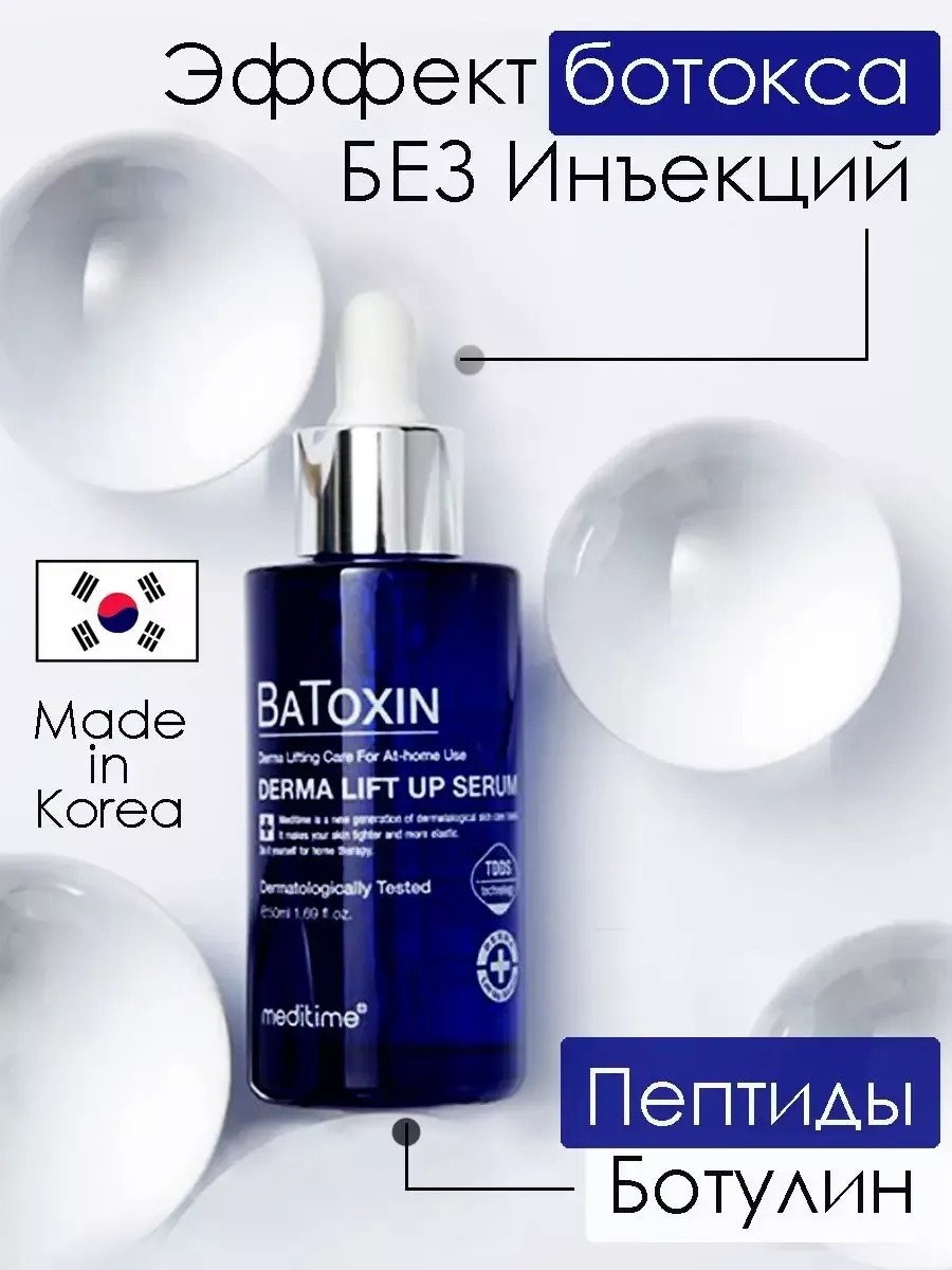 ффект ботокса без уколов! Лифтинг сыворотка Meditime Batoxin Derma Lift Up - это мощное средство для ухода за кожей лица, шеи и декольте. Продукт оказывает мощный anti age эффект, разглаживает кожные заломы и глубокие морщины, защищает кожу от дряблости и провисания. Антивозрастная сыворотка от морщин работает подобно ботоксу: расслабляет кожные заломы, блокирует образование складок. Это происходит за счёт широкого комплекса активных компонентов, так как пептиды, ботулотоксин и витамин С. Она также работает как супер увлажняющая сыворотка благодаря гиалуроновой кислоте. Активные компоненты с помощью запатентованной технологии TDDS глубоко проникают в кожу и дарят ей упругость, ровный и здоровый тон. Сыворотка также содержит витамин с - его инновационную стабильную форму, 3-О этил-аскорбиновая кислота. Он работает как мощный осветлитель возрастной пигментации, выравнивает тон, придаёт лицу здоровое сияние. CICA-комплекс на основе компонентов центеллы азиатской тонизирует кожу, повышает её защитные функции, защищает от негативного воздействия ультрафиолета и внешней окружающей среды. Дневная и ночная сыворотка имеет накопительный эффект: используйте её курсом 2 месяца дважды в день, затем сделайте перерыв на 1-2 месяца. Подходит проблемной и жирной, сухой и комбинированной, чувствительной кожи. Сыворотку можно использовать для массажа лица, или как средство перед макияжем.