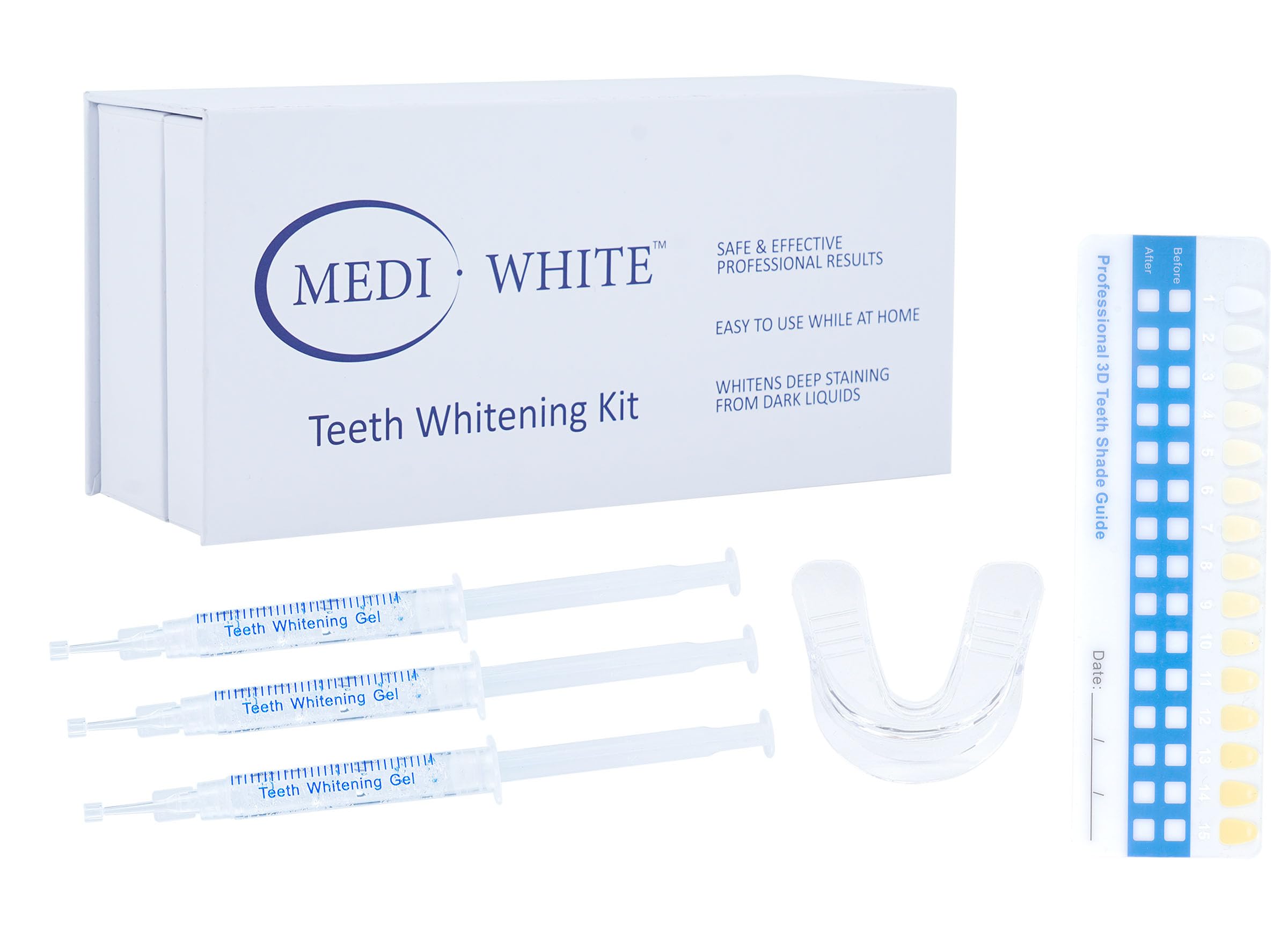 Caution: Store in a cool, dry place. Keep out of reach of children. Avoid contact with eyes and minimize exposure to gums. DO NOT USE this product consecutively for more than two weeks. DO NOT USE if you have periodontal disease, existing gum damage, or if your gums have not recovered from previous treatment. DO NOT USE this product if you're pregnant or breastfeeding, or if your teeth and gums are not in healthy condition. Discontinue use if you experience gum bleeding or significant tooth sensitivity. If discomfort persists, reduce usage frequency or stop use entirely. Medi White Commitment At MediWhite, we are committed to delivering exceptional customer service and top-quality products. If you are not completely satisfied with our teeth whitening Kit, just let us know—we're here to ensure your whitening experience is safe, comfortable, and effective. Easy to Use Our product is safe for at-home teeth whitening. For best results, start by brushing and drying your teeth. Apply the whitening gel to the inner surface of the tray, then place the tray into your mouth to cover your teeth properly. After 20-30 minutes, rinse your mouth thoroughly with clean water. Fast-acting Formula MediWhite's teeth whitening gels use a safe and effective whitening formula. The whitening gel contains 38 HP-CP, which immediately gives you visible whitening results after first use. This formula is best suited for people with relatively insensitive teeth and for those seeking fast-acting results. Comfortable Safe Trays The included high-quality, BPA-free teeth whitening trays ensure the whitening gel is spread evenly over your teeth for consistent whitening results. Designed for comfort and safety, the trays make your at-home whitening experience both easy and reliable. Remove Stubborn Stains MediWhite's professional teeth whitening gel can effectively remove stains from coffee, smoking, wine, soda, solid food, etc. Using the application once a day gradually whitens your teeth, helping you achieve a more confident smile. With regular use (usually no more than two weeks per treatment cycle), your teeth may be brightened by 4-8 shades.