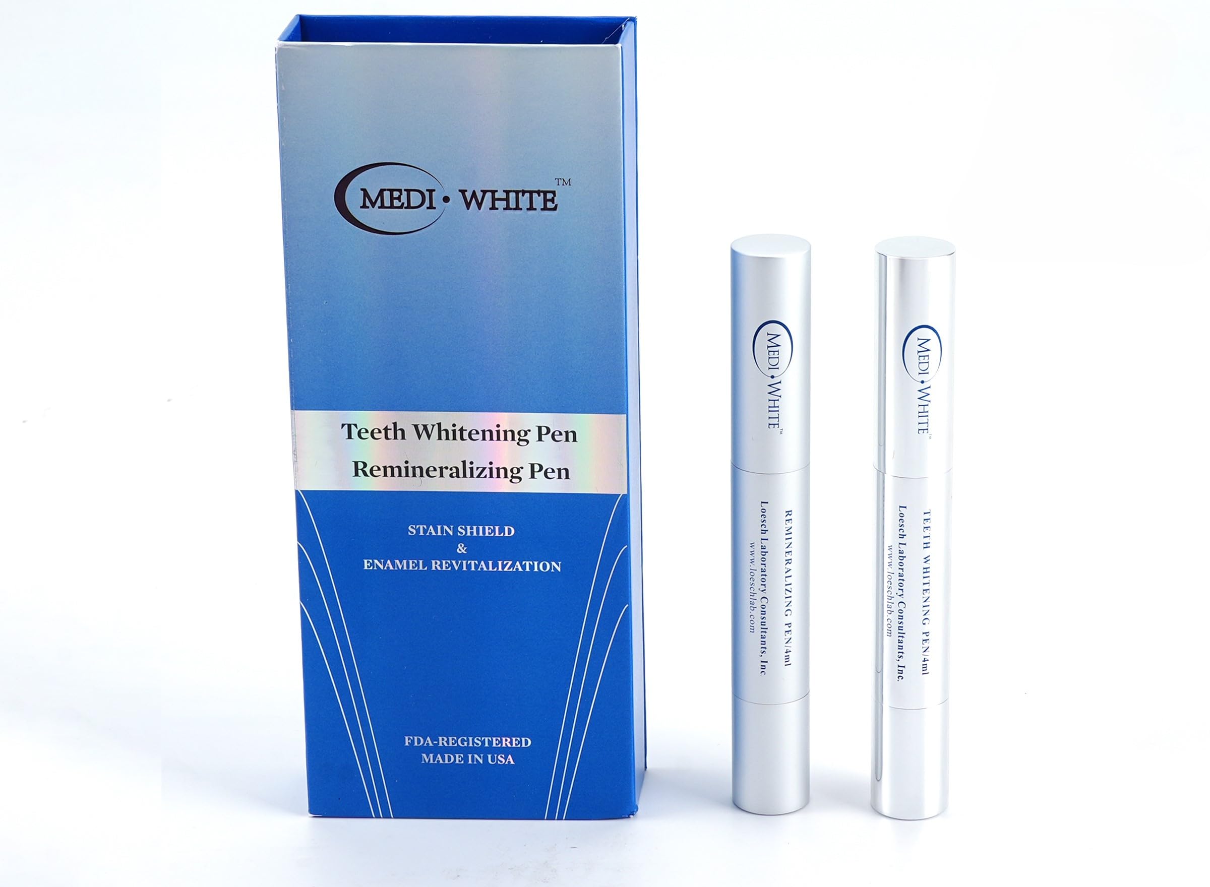 Caution: Store in a cool, dry place. Keep out of reach of children. Avoid contact with eyes and minimize exposure to gums. DO NOT USE this product consecutively for more than two weeks. DO NOT USE if you have periodontal disease, existing gum damage, or if your gums have not recovered from previous treatment. DO NOT USE this product if you're pregnant or breastfeeding, or if your teeth and gums are not in healthy condition. Discontinue use if you experience gum bleeding or significant tooth sensitivity. If discomfort persists, reduce usage frequency or stop use entirely. MediWhite Commitment At MediWhite, we are committed to delivering exceptional customer service and top-quality products. If you are not completely satisfied with our teeth whitening Kit, just let us know—we're here to ensure your whitening experience is safe, comfortable, and effective. Easy to Use Our product is safe for at-home teeth whitening. For best results, start by brushing and drying your teeth. With the soft brush tip of the pen, gently apply the 16 CP gel to every tooth and crevice for comprehensive whitening, and wait for 20-30 minutes. Then rinse your mouth with clean water. After that, apply the remineralizing gel to the target teeth, wait for 5-30 minutes. Then rinse your mouth with clean water again. With regular use, your teeth may be brightened by 4-8 shades. Restoration Protection The included MediWhite's remineralizing gel is designed to return essential minerals to your teeth, such as calcium, magnesium, potassium, etc. which makes it the ideal follow-up after teeth whitening. In combination with the whitening pen, the remineralizing gel helps reduce teeth sensitivity and strengthens tooth enamel. It provides fast relief of discomfort and long-lasting protection against future sensitivity. Fast-acting Formula MediWhite's teeth whitening pen is formulated with 16 CP gel, which features a gentle effective whitening process. This gel is ideal for users with sensitive teeth, or those who want to maintain the whitening results over the long term. This whitening pen is suitable for use at home, at work, or while traveling. Each 4ml pen can be used for over 40 times. Remove Teeth Stains MediWhite Dual Action Teeth Whitening Pen kit can effectively remove stains from coffee, smoking, wine, soda, solid food, etc, while simultaneously protecting your teeth during use. Using the application once a day gradually whitens your teeth (usually no more than two weeks per treatment cycle), helping you achieve a brighter, more confident smile over time.