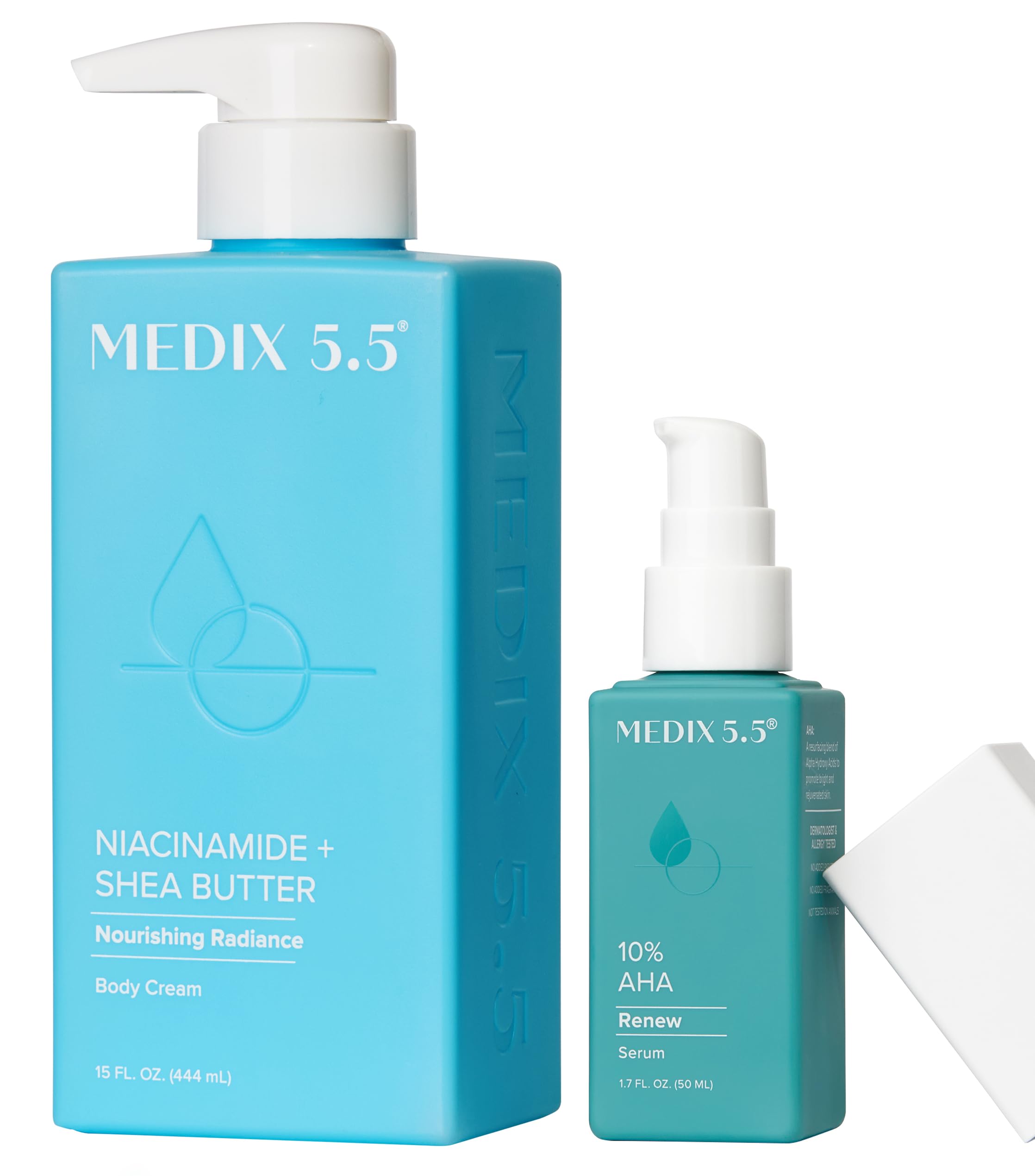 Experience radiant, velvety-soft skin with our Niacinamide Shea Butter Nourishing Radiance Body Cream. This lightweight, creamy formula helps minimize the look of pores, even out skin tone, and soften the appearance of fine lines and wrinkles—all while delivering rich moisture for a healthy, glowing complexion. Reveal radiant, smoother-looking skin from head to toe with our 10 AHA Renew Serum. This leave-on formula gently exfoliates to improve texture, even skin tone, and diminish the look of fine lines. Enriched with hydrating botanicals and antioxidants, it leaves your body feeling renewed, soft, and glowing. No added fragrance.RENEW, FIRM, RESTORE – Dermatologist-Tested, Clinically-Tested, Allergy-Tested. Non-Greasy Fast-Absorbing Formula, Fragrance Free, Cruelty Free. Free From: Mineral Oil, Parabens, Drying Alcohols, PEGs, Sulfates, Dyes. Manufactured in our cGMP MoCRA compliant facility in Chicago, USA. Whatever your skin type, Medix 5.5 has its natural solution. Restore a more youthful glow to your skin with the power of Niacinamide and scientifically proven formulas. EFFECTIVE EXFOLIATION – Formulated to provide an effective exfoliation without excessive irritation or sensitization of the skin, while not having to be rinsed off after being applied. Alpha Hydroxy Acid (AHA), Glycolic Acid, Phytic Acid, Lactic Acid all work together to gently resurface skin, clear pores, and boost collagen production making your skin feel smoother, feel more youthful, look more radiant. WHAT IS AN AHA? – Alpha Hydroxy Acids (AHA's) are chemical exfoliants, meaning they exfoliate the skin without rubbing or scrubbing. They are considered a gentle yet efficient way to remove dry skin, dead skin cells, and impurities that block your pores. Effective solution for those who have hardened skin, bumps, dull skin, uneven texture, uneven skin tone, rough areas, calluses, etc. FRAGRANCE FREE LOTION – This Non-Greasy Fragrance Free Niacinamide Cream Shea Butter Lotion absorbs easily into the skin and is rich enough to be a long-lasting body moisturizer, but also gentle enough to be used as daily facial moisturizer. Formulated to be safe for all skin types, including oily skin sensitive skin. Hydrate dull, lackluster skin with MEDIX Niacinamide Shea Butter Face Lotion Body Cream to help leave your skin looking smoother, firmer, more radiant. NIACINAMIDE BODY LOTION – Niacinamide is also known as vitamin B3, which works as a multi-functional skin care ingredient renowned for its antioxidant properties that helps prevent premature aging protect against environmental stressors. Niacinamide is known to strengthen the skin's natural barrier, minimize moisture loss, regulate oil production to help prevent breakouts, shrink enlarged pores, decrease dark spots, and promote a radiant complexion.