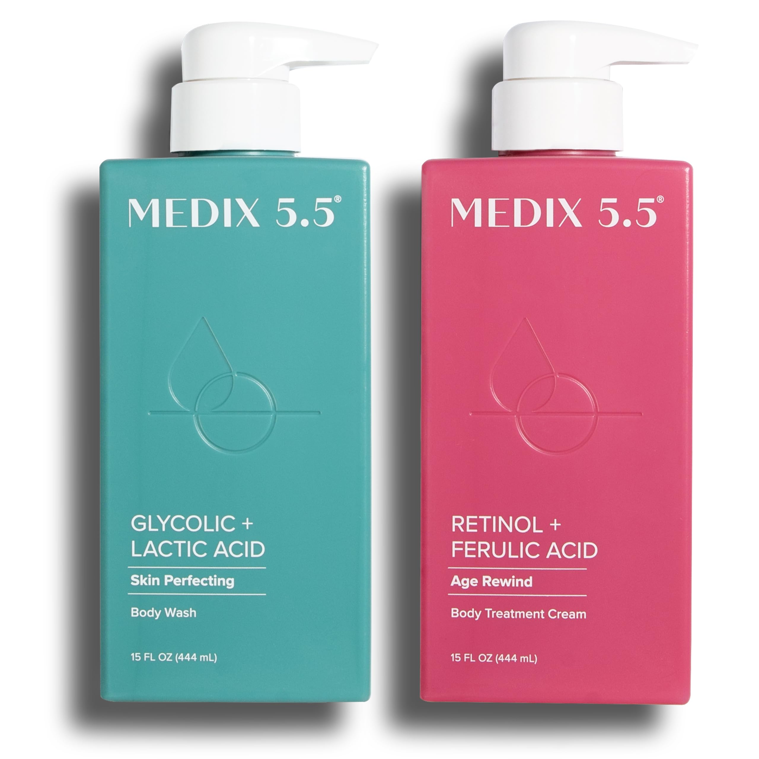 Seeking bouncy, resilient skin that "snaps back"? This retinol cream restores collagen production giving the skin a plump appearance. In this body-centric formula, Retinol is paired with powerful antioxidants Ferulic Acid and EGCG-rich Green Tea, to help support elastic skin. A fan favorite that is your first step to healthy, radiant skin. This sulfate-free daily body wash is infused with alpha hydroxy acids. Formulated to prepare skin for treatments by removing dry, dull skin that builds up on the surface.RELAX RESTORE – Non-Greasy Formula, Vegan, Cruelty-Free. Free From: Parabens, Drying Alcohols, Animal-Derived Ingredients, PEGs, Sulfates, Dyes, Talc, Mineral Oil. Manufactured in our FDA-Regulated Inspected Laboratory in Chicago, USA. RETINOL BEGINNERS, please take care to test cream on a small area of skin, gradually phg into your skincare routine, working up to twice daily as tolerated. If irritation occurs, reduce frequency. If irritation persists, discontinue use. EFFECTIVE ANTI-AGING INGREDIENTS – Medix 5.5 Retinol Cream is infused with Ferulic Acid, Shea Butter, Vitamin E, Green Tea, which all work together to effectively firm skin reduce the appearance of sun damaged skin, wrinkles, fine lines, crepey skin. Aloe Vera defends against visible redness irritation. Green Tea Chamomile guards against environmental damage reduces puffiness. Combination of ingredients make this Retinol Body Cream non-irritating unlike many other retinol products. RETINOL CREAM – Vitamin A (Retinol) is considered to be the 1 Dermatologist recommended anti aging skin care ingredient. It is known to diminish the look of deep wrinkles, fine lines, sagging skin, crepey skin, sun damage while boosting collagen production to help with firming. Medix 5.5 Retinol Body Lotion Age Rewind Moisturizer Cream is the perfect combination of anti aging ingredients with natural-antioxidants to help you promote more radiant skin and a more youthful look. SMOOTH SKIN: Glycolic Acid (AHA) Lactic Acid exfoliates away surface bumps dry skin allowing for increased absorption for skin care products to penetrate more deeply into the skin and also work more effectively, while Salicylic Acid (BHA) goes deep into your pores hair follicles to target problematic oil build up sources of KP. Multi-use face cleanser body cleanser that was carefully developed for all skin types, can be used daily, and also can also be used as a facial cleanser. EXFOLIATING FACE BODY WASH FOR CLEAR SKIN: A foaming, sulfate free, Peppermint Eucalyptus Oil scented, Glycolic Acid (AHA) Lactic Acid Exfoliating Face Wash Body Wash that will effectively soften dry flakey skin, help remove dead skin cells, promote cell turnover, target keratin build ups, freshen up skin tone, help prevent breakouts clear ingrown hairs, target keratosis pilaris, reduce rough bumpy skin. Exfoliating body scrub for making skin feel softer, smoother, more supple.