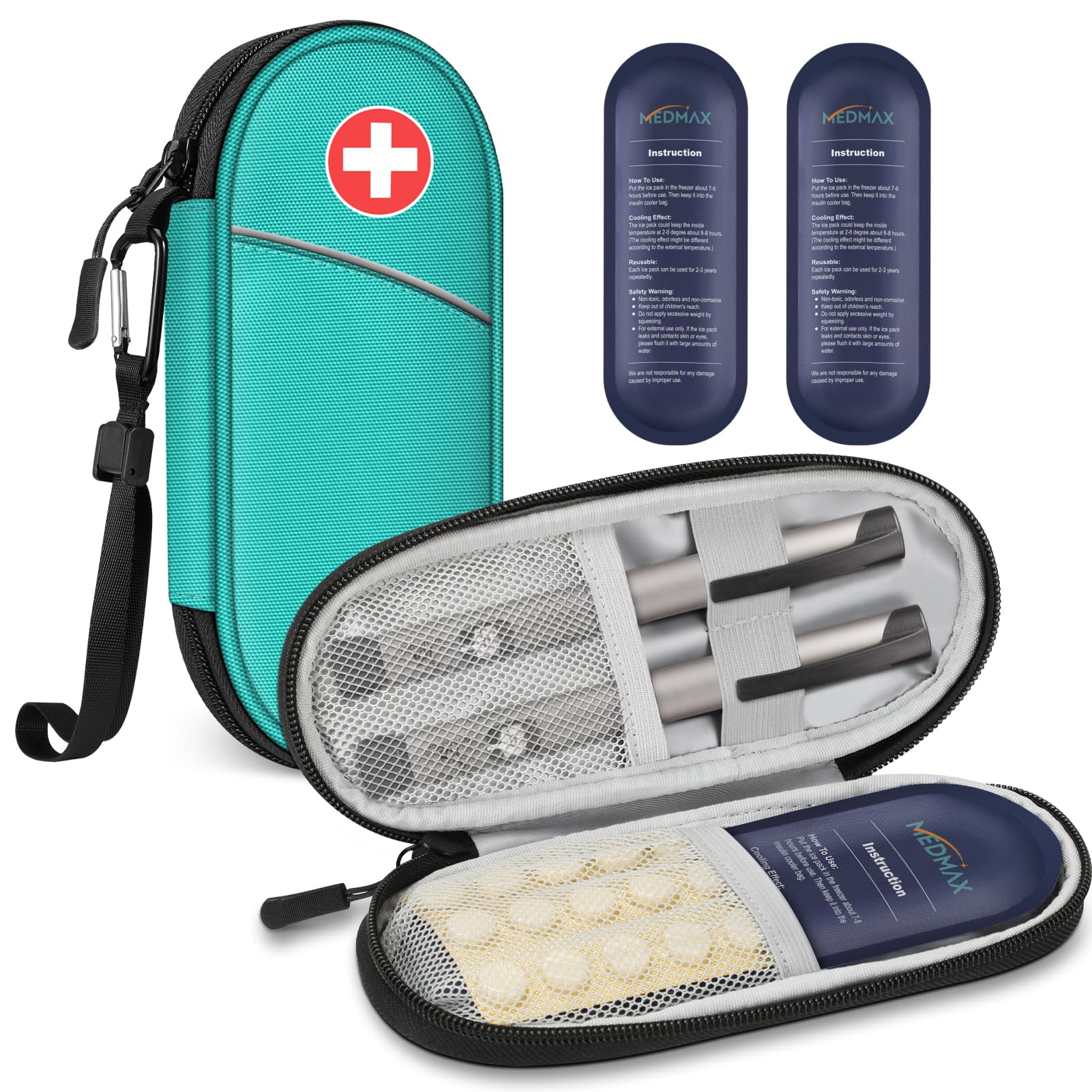 ?Everything in one? Come with 2 reusable cooling packs.Note: The ice pack must be cooled 6 to 8 hours before use.Perfect companion of the daily life of insulin addicts.Package includes: a travel bag and 2 cooling packs (not contained other accessories!).?Contain emergency infocarte? The Medmax Medicine carrier bag is supplied with an emergency contact information card that contains your information and that of your doctor.It is useful in emergencies and offers another way to ensure your security.The ID window on the back of the bag can hide the emergency card information and protect your personal data.?Travel -friendly? Come with a portable hand loop and carabin hook, ready for all situations and go everywhere without worries, perfectly portable and comfortable.With the high-quality YKK zipper, this compact medication bag bag is durable and safe for quick access.Reflecting stripes make it noticeable at night.?Water -repellent and isolated? Made of water -repellent and wear -resistant external, prevents possible scratches.The isolated feed with foam padding ensures that adrenaline, insulin pencils, vials, injections or other temperature -sensitive medication are not influenced by the outside temperature.Your supplies are safe and healthy in the isolated medication bag.?Well organized? The upper two elastic ligaments can hold objects such as insulin pencils, vials or syringes.The lower network bag is used to store the ice cream bag.(Come with 2 reusable cooling packs, one as a replacement).