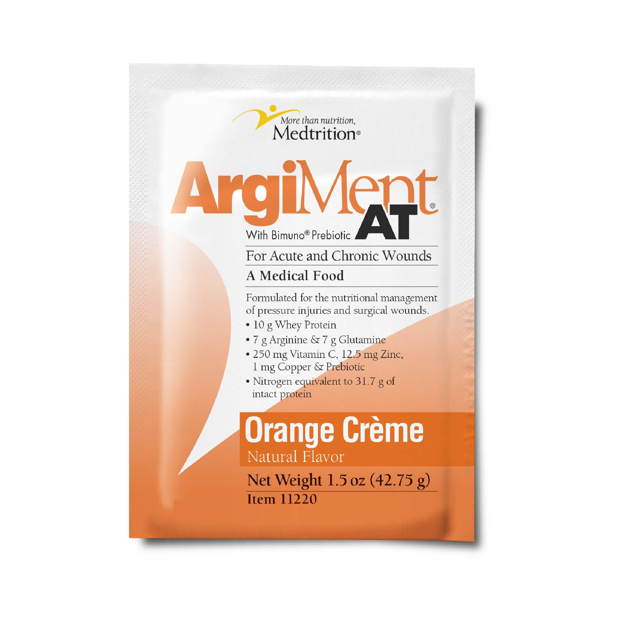 ArgiMent AT is specifically formulated to provide essential nutrients for the dietary management of pressure injuries and wounds. Each serving contains whey protein, Arginine, Glutamine, Vitamin C, elemental zinc, copper, and prebiotic.