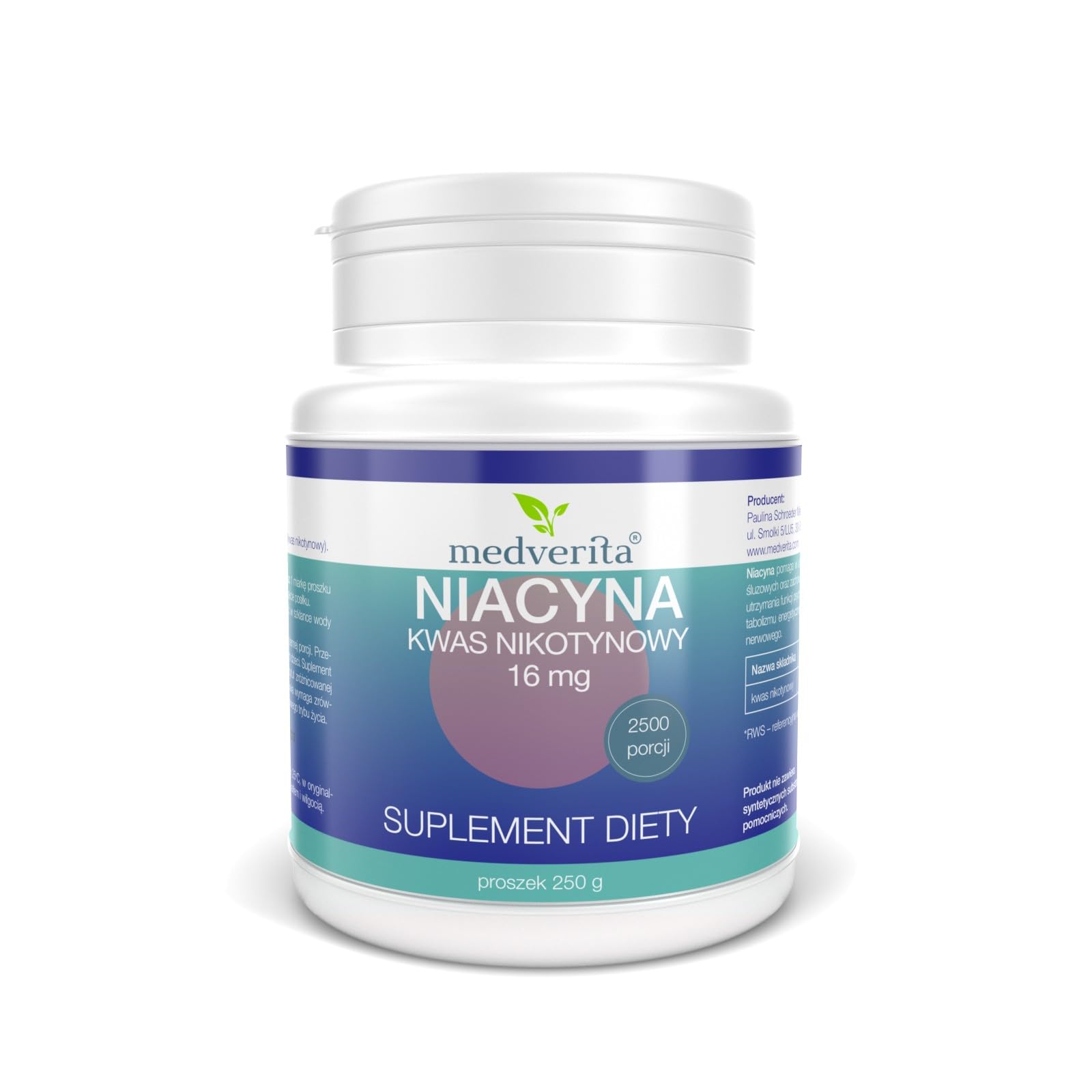 Net content: 250 g 2500 portions Weight of the portion: 100 mg Recommended consumption per day: take 1 measuring spoon powder (100 mg) once a day, preferably for a meal. Application: Dissolve 1 measuring spoon powder in a glass of water or juice and drink. The daily portion contains: Niacin in the form of nicotine acid - 16 mg (100 RWS ). - percent of the recommended daily dose. Manufacturer: Medverita Group Paulina Schroeder Ul. Smolki 5 LU5 Kraków 30-513 Ingredients ingredients Inulin (zichorie root), niacin (nicotine acid). Warnings It is a dietary supplement, not a medicine.Do not use with allergy sufferers.The recommended daily dose should not be exceeded.To get health, a balanced diet and a healthy lifestyle should be followed.The dietary supplement must not be used as a substitute (replacement) for a varied diet.Store dry, at room temperature and outside the range of small children.Not recommended for pregnant women or breastfeeding women and children. Interestingly, morecan increase vitamin B3 according to a study by researchers from the federal polytechnic university of Lausanne in Switzerland.This is due to the effect of niacin, which affects the activity of the mitochondria in the Nucleus Accumbens, which is responsible for the sensation of pleasure.The positive effects of vitamin B3 on the human psyche are also incregly mentioned - it is likely that the regular use of vitamin B3 is helpful in the treatment of depression (according to scientific studies there is currently no evidence that niacin for the treatment ofDepression can be used, but there are indications that people with depression can have a lack of B vitamins).Research shows that niacin acts against migraines, which is why it is contained in this type of medication.In addition, it has a positive effect on the skin - it relieves acne.Interestingly, vitamin B3 also helps with skin discoloration.It is able to penetrate into the deeper layers of the skin so that it can treat redness, excessive peeling of the epidermis and inflammation.On the other hand, vitamin B3 is also responsible for the synthesis of sex hormones, thyroxine and cortisol.Niacin is involved in the synthesis of insulin and regulates cholesterol by reducing the serum level of bad LDL and triglycerides.It extends the blood vessels, is involved in the formation of red blood cells, improves the bloodstream, improves the condition of skin and hair and has a positive effect on human psyche.Vitamin B3, also called Niacin, has a number of very important functions in the human body.First of all, it is essential for the smooth functioning of the peripheral nervous system and the brain.Nicotic acid team influences the metabolism of proteins, lipids, nucleic acids and carbohydrates, since it is a forerunner of the coenzymes (NAD and NADP) that are part of the oxidoreductase.Nettoinhalt: 250 g 2500 Portionen Gewicht der Portion: 100 mg Empfohlene Verzehrmenge pro Tag: Nehmen Sie 1 Messlöffel Pulver (100 mg) einmal täglich, vorzugsweise zu einer Mahlzeit, ein. Anwendung: 1 Messlöffel Pulver in einem Glas Wasser oder Saft auflösen und trinken. Die Tagesportion enthält: Niacin in Form von Nikotinsäure - 16 mg (100 RWS ). - Prozent der empfohlenen Tagesdosis. Hersteller: Medverita Group Paulina Schroeder ul. Smolki 5 LU5 Kraków 30-513 INHALTSSTOFFE ZUTATEN Inulin (Zichorienwurzel), Niacin (Nikotinsäure). WARNHINWEISE Es handelt sich um ein Nahrungsergänzungsmittel, nicht um ein Arzneimittel. Nicht bei Allergikern verwenden. Die empfohlene Tagesdosis darf nicht überschritten werden. Um die Gesundheit zu erhalten, sollten eine ausgewogene Ernährung und eine gesunde Lebensweise befolgt werden. Das Nahrungsergänzungsmittel darf nicht als Substitut (Ersatz) für eine abwechslungsreiche Ernährung verwendet werden. Trocken, bei Raumtemperatur und außerhalb der Reichweite von kleinen Kindern aufbewahren. Nicht empfohlen für schwangere oder stillende Frauen und Kinder. MehrInteressanterweise kann Vitamin B3 laut einer Studie von Forschern der Eidgenössischen Polytechnischen Universität Lausanne in der Schweiz das Selbstvertrauen steigern. Dies ist auf die Wirkung von Niacin zurückzuführen, das die Aktivität der Mitochondrien im Nucleus accumbens, der für das Lustempfinden zuständigen Gehirnregion, beeinflusst. Auch die positiven Auswirkungen von Vitamin B3 auf die menschliche Psyche werden immer häufiger erwähnt - es ist wahrscheinlich, dass die regelmäßige Einnahme von Vitamin B3 bei der Behandlung von Depressionen hilfreich ist (laut wissenschaftlichen Studien gibt es derzeit keine Beweise dafür, dass Niacin zur Behandlung von Depressionen eingesetzt werden kann, aber es gibt Hinweise darauf, dass Menschen mit Depressionen einen Mangel an B-Vitaminen haben können). Die Forschung zeigt, dass Niacin gegen Migräne wirkt, weshalb es in dieser Art von Medikamenten enthalten ist. Darüber hinaus hat es eine positive Wirkung auf die Haut - es lindert Akne. Interessanterweise hilft Vitamin B3 auch bei Hautverfärbungen. Es ist in der Lage, in die tieferen Schichten der Haut einzudringen, so dass es Rötungen, übermäßiges Abschälen der Epidermis und Entzündungen behandeln kann. Zum anderen ist Vitamin B3 auch für die Synthese von Sexualhormonen, Thyroxin und Cortisol verantwortlich. Niacin ist an der Synthese von Insulin beteiligt und reguliert den Cholesterinspiegel, indem es den Serumspiegel von schlechtem LDL und Triglyceriden senkt. Es erweitert die Blutgefäße, ist an der Bildung roter Blutkörperchen beteiligt, verbessert den Blutkreislauf, verbessert den Zustand von Haut und Haaren und wirkt sich positiv auf die Psyche des Menschen aus. Das Vitamin B3, auch Niacin genannt, hat im menschlichen Körper eine Reihe sehr wichtiger Funktionen. Zunächst einmal ist es für das reibungslose Funktionieren des peripheren Nervensystems und des Gehirns unerlässlich. Nicotinsäureamid beeinflusst den Stoffwechsel von Proteinen, Lipiden, Nukleinsäuren 