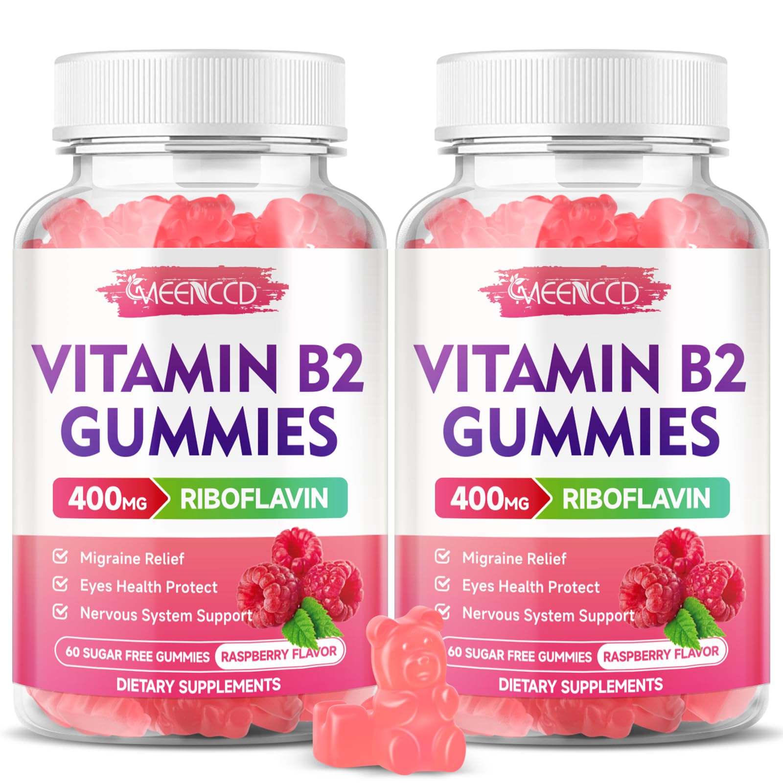 MEENCCD 2 Pack Vitamin B2 Gummies Riboflavin 400mg Supplement with Magnesium for Kids & Adults B2 Gummies for Migraine Relief Support Vegan Sugar-Free Raspberry Flavor 120 Count