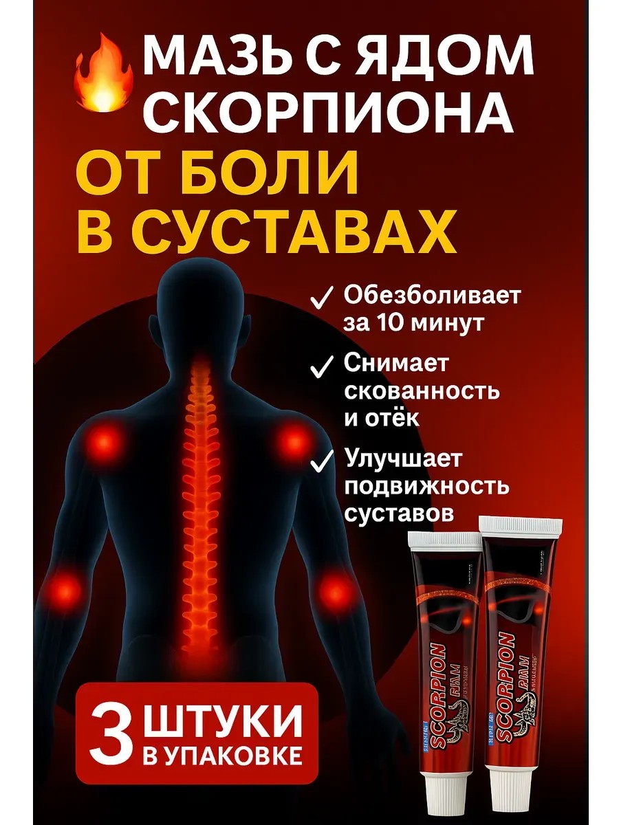 ;артрит, артроз, остеохондроз, ревматизм;радикулит, миалгия, защемление нервов;судороги, онемение, ощущение скованности;растяжения, ушибы, отеки, спортивные травмы.Ключевые преимущества набора:3 тюбиков — надолго хватит: удобно распределить по разным местам — дома, в машине, в сумке.экономия до 3 месяцев без переплат и повторных заказов.натуральный состав: экстракты трав + яд скорпиона — мощное сочетание против боли. Моментальное впитывание: не оставляет жирных следов и запаха. Компактный формат: удобно брать с собой в спортзал или дорогу.Многофункциональность: одна мазь — десятки решений!Кому особенно подойдёт: