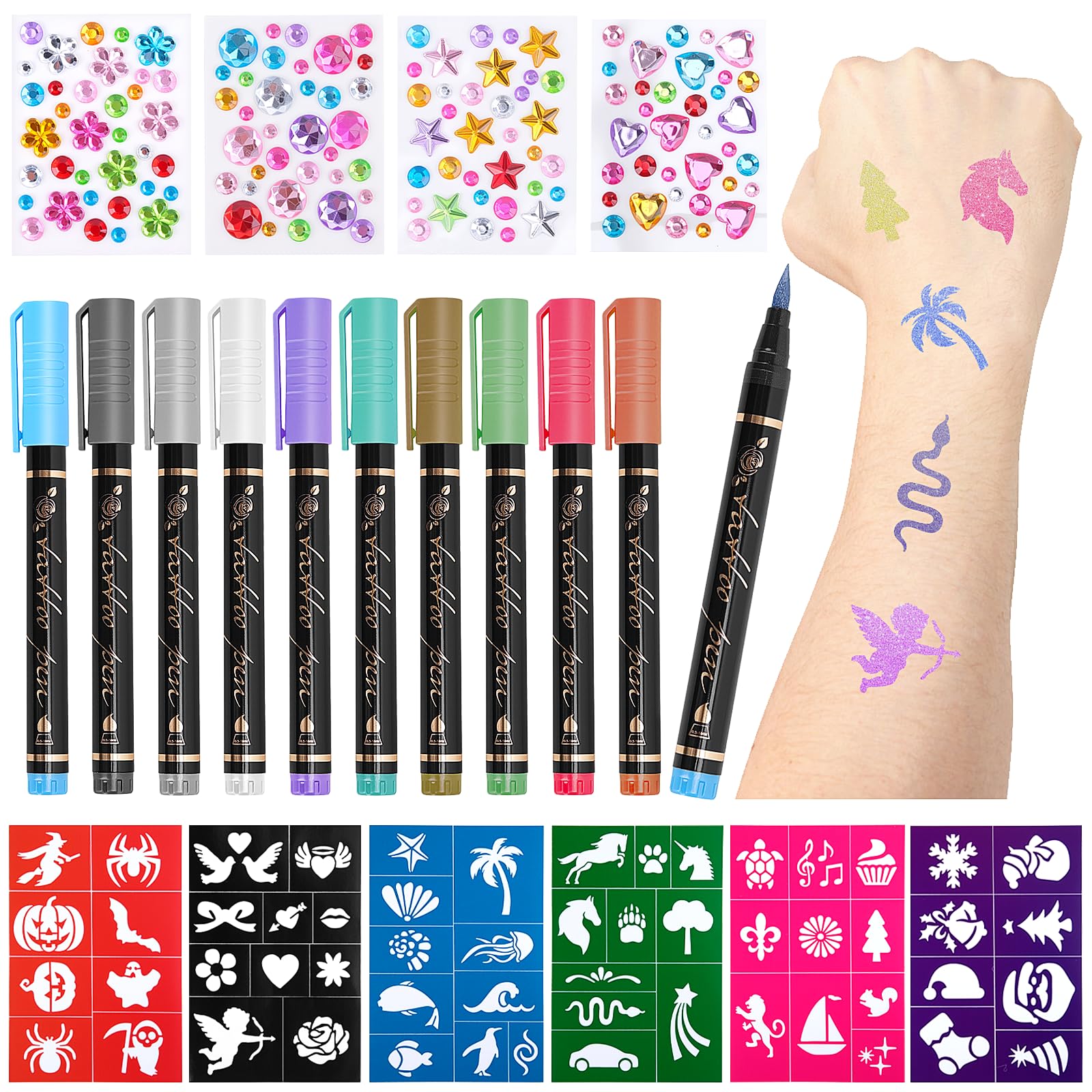 This glitter tattoo set offers 10 vibrant metallic colors with a brilliant glitter effect for eye-catching artwork that lasts all day. It includes 6 stencils with 56 designs and 4 glitter gem stencils to encourage creativity in children and adults. The water-based pens are easy to remove from skin and most surfaces with soap and water and leave no residue. The kit is ideal for holidays such as Easter, Halloween, Christmas, birthday parties, art festivals, and role-playing, making it a versatile creative kit for all occasions. Instructions: 1. Close the cap before use and shake the pen. 2. Air the tip by pressing down on it (only the first time). 3. Press down continuously on the tip until the ink flows. 4. Do not press down on the tip while writing. 5. After use, tighten the cap and store the pen flat. 6. Wash the tattoos by hand in warm water or liquid hand soap. Caution: 1. On rough surfaces, draw slowly to avoid ink splatter. 2. To avoid smudging, apply a very thin layer first. Let it dry before applying. 3. When using a spray sealant, be careful not to hold it too close to the object while spraying, as it will stain even with a thin layer. Package Contents: 10 glitter tattoo pens (white, purple, orange, blue, red, gray, silver, gold, green, gemstone green). 6 stencils (56 designs). 4 glitter stencils (circle, heart, star, flower). SAFETY WARNING Not suitable for children under 36 months.Perfect for parties and occasions: The glitter tattoo kit is ideal for holidays such as Easter, Halloween, and Christmas, as well as birthday parties, art festivals, role-playing games, and other special occasions. A versatile creative kit for everyone. Skin-friendly and long-lasting: Our tattoo pens are made from premium, non-toxic materials and are safe for human use. The formula dries quickly and lasts all day. The pen cap should be tightly closed after use. Easy to clean and versatile: The water-based tattoo pens are easy to remove from skin and most surfaces with soap and water without leaving any residue. Perfect for temporary tattoos on the body and face, as well as for decorating cards, mugs, stones, mirrors, and more. Various stencils and rhinestones: This glitter tattoo set contains 6 stencils with 52 unique designs and 4 sparkling rhinestone designs (circle, flower, star, heart) to inspire creativity and create individual designs. Ideal for children and adults. Vibrant metallic colors: This glitter tattoo set contains 10 brilliant metallic shades with a dazzling, shimmering effect for eye-catching, sparkling artwork. The vivid colors last all day and are perfect for all your creative projects.Meetory Lot de 10 crayons de maquillage temporaires à paillettes, imperméables, doux pour la peau, pour les humains, les adultes, Halloween, fête, anniversaire, avec 6 pochoirs et 4 pierres précieusesDESCRIPTION DU PRODUIT DESCRIPTION DU PRODUIT Ce lot de tatouages scintillants offre 10 couleurs métalliques vives avec un effet pailleté brillant pour des œuvres d'art accrocheuses qui durent toute la journée. Il comprend 6 pochoirs avec 56 motifs et 4 modèles de pierres scintillantes pour encourager la créativité des personnes et des adultes. Les stylos à base d'eau sont faciles à enlever de la peau et de la plupart des surfaces avec de l'eau et du savon et ne laissent aucun résidu. Le kit est idéal pour les fêtes telles que Pâques, Halloween, Noël, les fêtes d'anniversaire, les festivals d'art et les jeux de rôle, ce qui en fait un kit créatif polyvalent pour toutes les occasions. Mode d'emploi : 1. Fermez le capuchon avant utilisation et secouez le stylo. 2. Aérer la pointe en appuyant sur la pointe (uniquement la première fois). 3. Appuyez continuellement sur la pointe jusqu'à ce que l'encre sorte. 4. Ne pas presser la pointe lorsque vous écrivez. 5. Après utilisation, resserrez le capuchon et rangez le stylo à plat. 6. Lavez les tatouages à la main dans de l'eau chaude ou du savon liquide pour les mains. Attention : 1. Pour les surfaces rugueuses, dessinez lentement pour éviter les éclaboussures d'encre. 2. Pour éviter les bavures, appliquez d'abord une très fine couche. Laissez sécher avant l'application. 3. Lors de l'utilisation d'un scellant par pulvérisation, veillez à ce qu'il ne soit pas trop près de l'objet lors de la pulvérisation, car il est taché, même avec une fine couche. Contenu de l'emballage : 10 stylos de tatouage à paillettes (blanc, violet, orange, bleu, rouge, gris, argent, or, vert, vert pierre précieuse). 6 pochoirs (56 motifs). 4 pochoirs à paillettes (cercle, cœur, étoile, fleur). AVERTISSEMENT DE SÉCURITÉ Ne convient pas aux enfants de moins de 36 mois.Parfait pour les fêtes et les occasions : le kit de tatouages à paillettes est idéal pour les vacances telles que Pâques, Halloween et Noël, ainsi que pour les fêtes d'anniversaire, les festivals d'art, les jeux de rôle et d'autres occasions spéciales. Un kit créatif polyvalent pour tout le monde. Doux pour la peau et durable : nos stylos de tatouage sont fabriqués à partir de matériaux non toxiques de qualité supérieure et sont sans danger pour les humains. La formule sèche rapidement et dure toute la journée. Le capuchon du stylo doit être bien fermé après utilisation. Facile à nettoyer et polyvalent : les stylos de tatouage à base d'eau sont faciles à enlever de la peau et de la plupart des surfaces avec de l'eau et du savon sans laisser de résidus. Parfait pour les tatouages temporaires sur le corps et le visage, ainsi que pour décorer des cartes, des tasses, des pierres, des miroirs et plus encore. Différents pochoirs et strass : ce lot de tatouages à paillettes contient 6 pochoirs avec 52 motifs uniques et 4 modèles de strass scintillants (cercle, fleur, étoile, cœur) pour stimuler la créativité et créer des designs individuels. Idéal pour les personnes et les adultes. Couleurs métalliques vives : ce lot de tatouages à paillettes contient 10 t