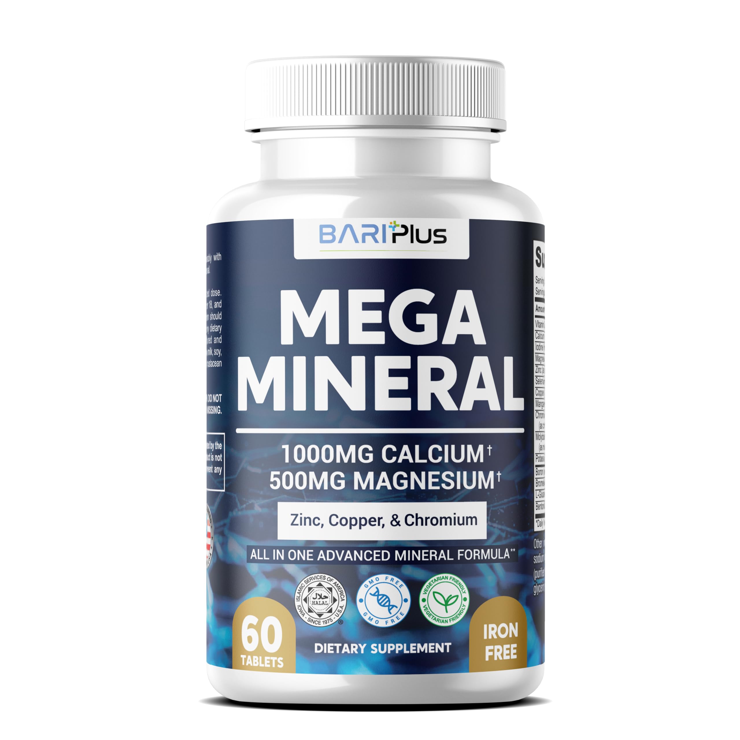 ✓ Digestive Nutrient Support Blend – Enriched with Bromelain and L-Glutamic Acid HCl to support digestion and gut wellness. ✓ Made for Bariatric Needs – BARIPLUS Mega Mineral is designed with bioavailable ingredients to support nutrient absorption and is ideal for post-surgery wellness routines. ✓ High Absorption Magnesium Zinc – Includes 500 mg of Magnesium and 22.5 mg of Zinc to promote muscle relaxation, nerve function, and immune health. ✓ Complete Bone Support – Formulated with 1000 mg of Calcium and 10 mcg (400 IU) of Vitamin D3 to support bone density, strength, and overall skeletal health. ✓ Easy-to-Swallow Tablets – 60 Count: One bottle provides a 30-day supply of high-potency mineral support in easy-to-swallow tablets, ideal for everyday wellness and active lifestyles. ✓ Halal Certified Clean Label: Halal Certified, gluten-free, non-GMO, and free from artificial colors, preservatives, and common allergens — made in a GMP-certified facility for trusted quality. ✓ Iron-Free Formula: Specifically designed ithout iron for individuals who do not require additional iron in their diet, making it safe for long-term daily use. ✓ 72 Trace Minerals from Sea Sources: Includes a rich blend of naturally sourced trace elements to help maintain electrolyte balance, energy levels, and overall cellular function. ✓ Complete Mineral Complex: Formulated with Calcium (1000mg) and Magnesium (500mg), plus essential minerals like Zinc, Potassium, Selenium, and Boron to support bone, muscle, and metabolic health.