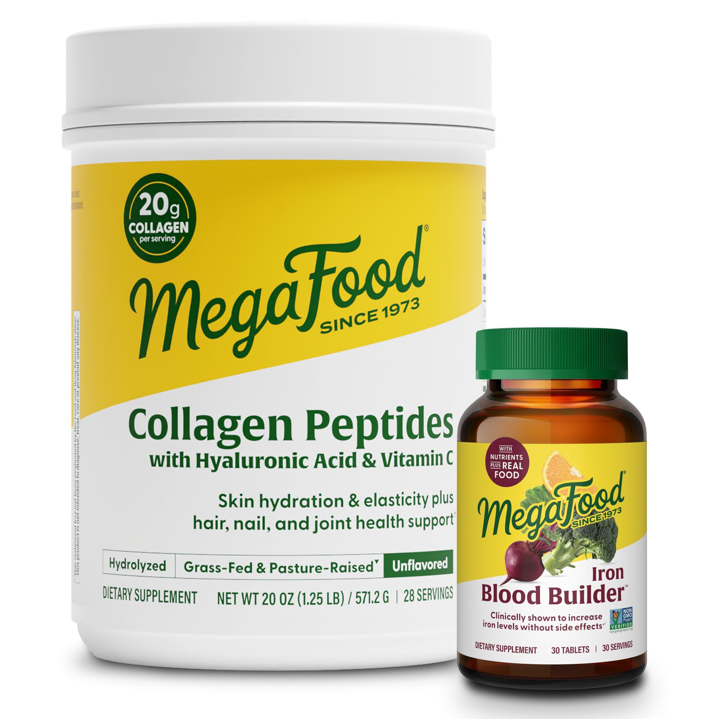 Free From Compromise: Gluten free, tested for 150 chemical substances, GMP quality assured, and made without the nine top food allergens, including milk, eggs, peanuts, tree nuts, soy, wheat, fish, shellfish, and sesame. Collagen, Hyaluronic Acid Vitamin C: Collagen supports skin hydration elasticity vitamin C supports collagen production, which supports skin, nail, and hair health hyaluronic acid helps support skin hydration and joint mobility . Supports Iron Levels: MegaFood Blood Builder has been shown to increase iron levels without constipation effective and gentle iron with vitamin C, folate, vitamin B12, and more. Supports Red Blood Cell Production: Blood Builder is an iron supplement for women and men that includes folic acid and B12, which helps maintain red blood cell production and delivers a gentle and effective 26 mg of iron per serving to combat fatigue and improve energy levels. Collagen Iron Supplement Combo Pack: Get 1 bottle of MegaFood Collagen Peptides (28 servings) and 1 bottle of MegaFood Blood Builder Iron Supplement (30 tablets).