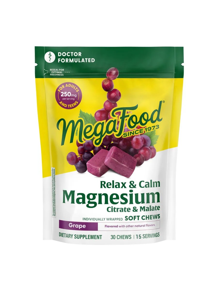MegaFood Magnesium Chewable Tablets for Calm and Relaxation contain an easily absorbed combination of magnesium citrate and magnesium malate.