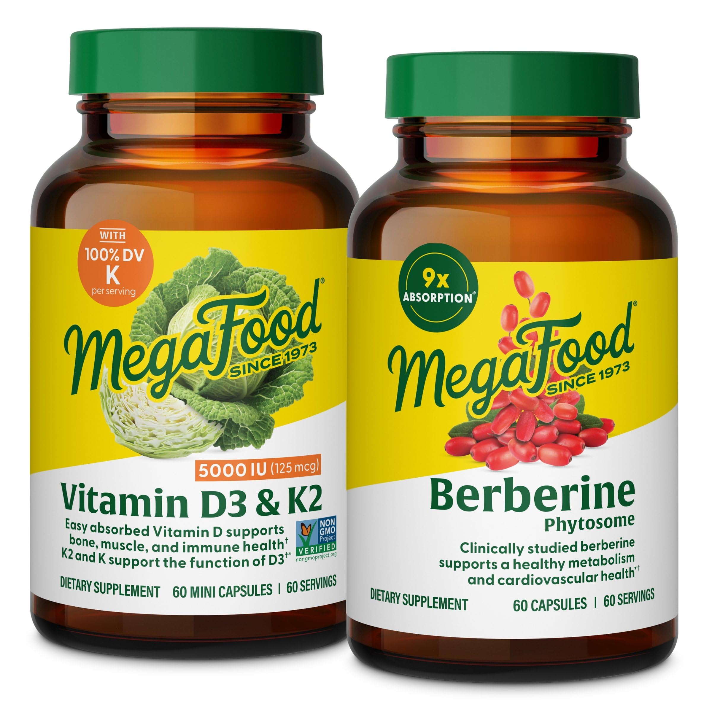Berberine with Better Absorption: Formulated with Indian barberry extract alongside pea protein and grape seed extract to offer better absorption . Metabolism Support: Berberine Phytosome supports metabolic and cardiovascular health with 550 mg of Berbevis per serving . Plus Vitamin K2: This immune system support supplement also contains vitamin K2 to support the function of vitamin D3 . Bone Health Supplement: Vitamin D3 supports bone, teeth, muscle, and immune health, and MegaFood's Vitamin D3 5000 IU is made with an easily absorbed form of vitamin D for high-potency immune support . Health Supplement Pack: MegaFood created this dietary supplement pack to offer daily support in one convenient bundle .