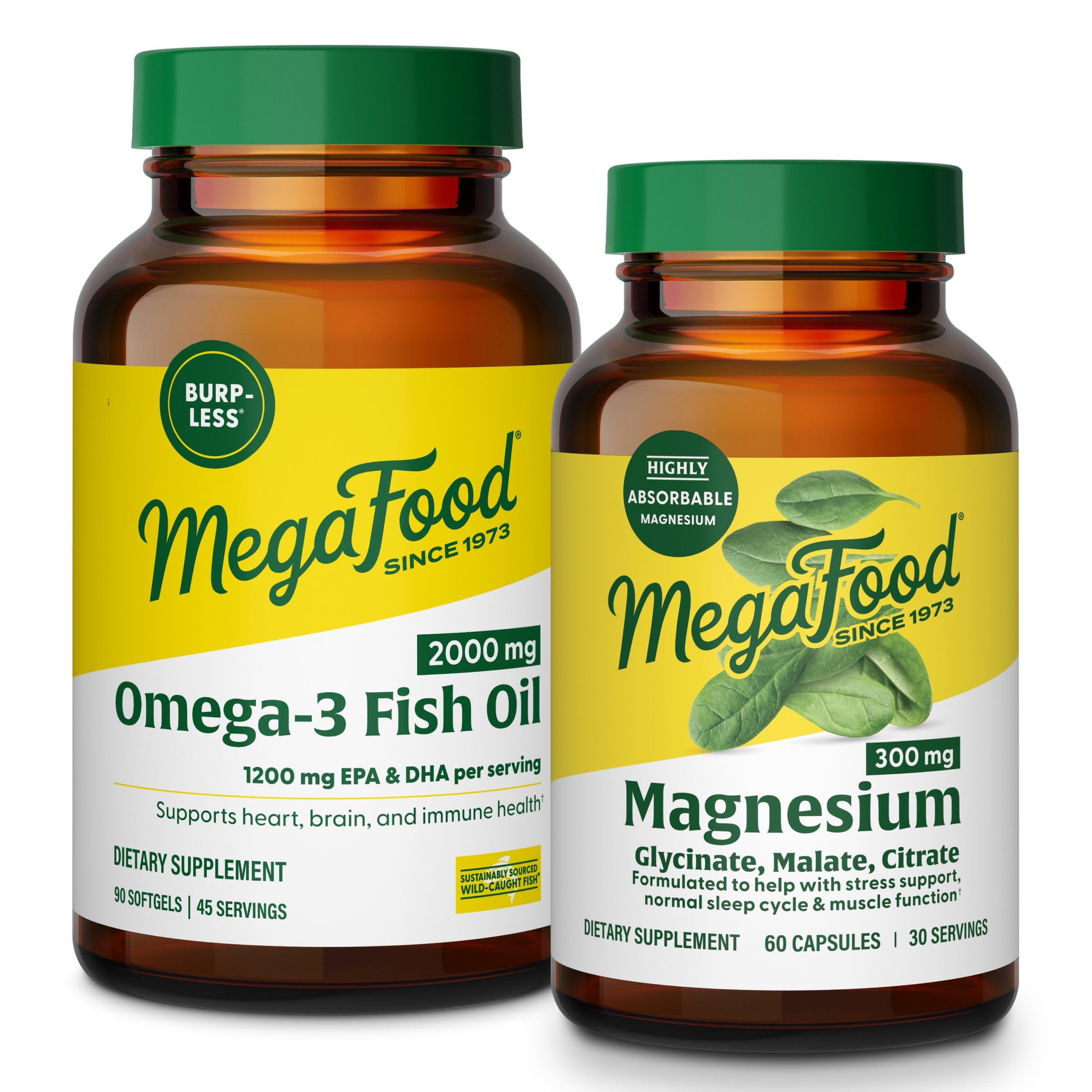 Free From Compromise: Gluten free, tested for 150 chemical substances, GMP quality assured, and made without eight top food allergens, including milk, eggs, peanuts, tree nuts, soy, wheat, shellfish, and sesame. Heart, Brain, Eye, Joint Immune Support: This Omega-3 supplement for women and men helps support heart, eye, immune, joint, and brain health with 2000 mg fish oil per serving. Three Forms of Magnesium: Provides three highly absorbable forms of magnesium (magnesium citrate, magnesium malate, and magnesium glycinate) 300 mg total of magnesium per serving. Magensium Supplement: Magnesium is an essential mineral that supports nerve, muscle, and heart health Magnesium 300 mg is formulated to be gentle and effective. Magnesium Complex Omega-3 Fish Oil Combo: Get 1 bottle of MegaFood Magnesium 300 mg (60 capsules 30 servings) and 1 bottle of MegaFood Omega-3 Fish Oil 2000 mg (90 softgels 45 servings).