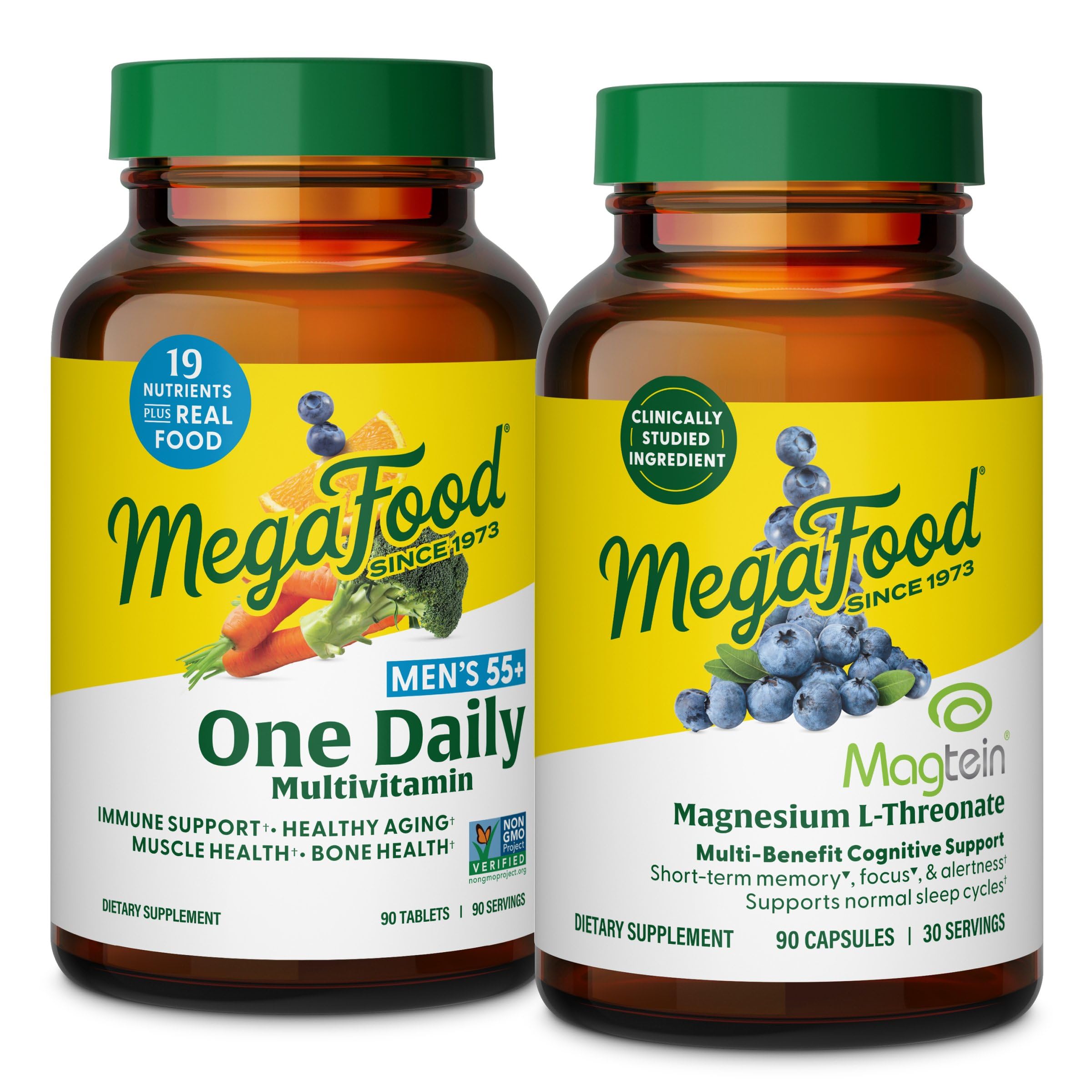 MegaFood Men's 55+ One Daily Multivitamin (90 Tablets) & Magtein Magnesium LThreonate (90 Capsules) Bundle - Supports Energy Nervous System & Health - Cognitive Support - Gluten Free & Vegetarian