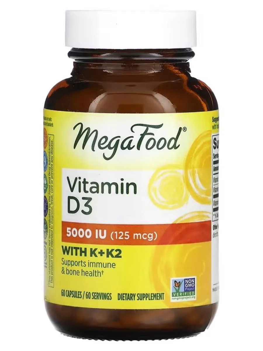 MegaFood Витамин D3 5000 МЕ (125 мкг) поддерживает здоровье костей, зубов, мышц и иммунитета. + Витамин D3 Холекальциферол - это легко усваиваемая и усваиваемая форма витамина D. В сочетании с калиями K и K2 он поддерживает оптимальное усвоение и распределение кальция, помогая поддерживать здоровье организма. кости.