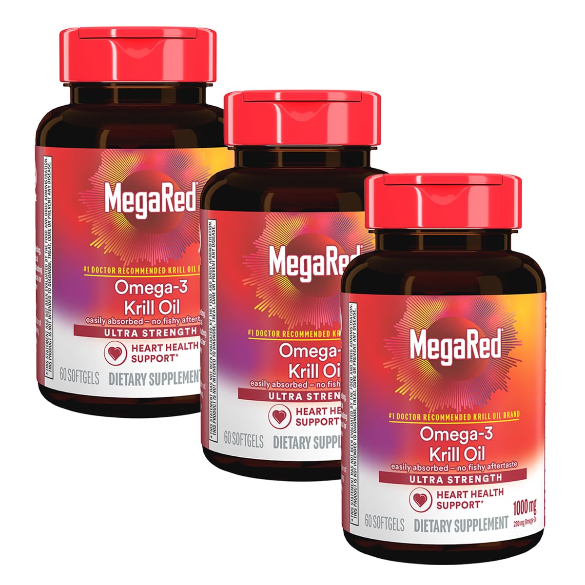 These statements have not been evaluated by the Food and Drug Administration. This product is not intended to diagnose, treat, cure or prevent any disease. 2X MORE OMEGA 3: One 1000mg MegaRed Ultra Concentrated softgel equals to two 500mg standard krill oil softgels1. NO FISHY AFTERTASTE and EASY ABSORPTION: Krill Oil is carried in a phospholipid form which can be easily absorbed by the human body and because it's krill oil as opposed to fish oil, MegaRed Krill Oil has no fishy aftertaste or odor. HEART HEALTH: MegaRed Krill Oil Omega 3 fatty acid supplements provide a significant level of omega-3 fatty acids to support heart health in a once daily softgel. OMEGA 3 SUPPLEMENT: MegaRed Omega3 Krill Oil has been shown to significantly increase your omega 3 index. ANTARCTIC KRILL OIL: Krill is one of the world's most abundant and sustainable organisms. MegaRed only sources krill from the Antarctic where krill is most abundant. MegaRed is the 1 Doctor Recommended Krill Oil Brand for heart health.
