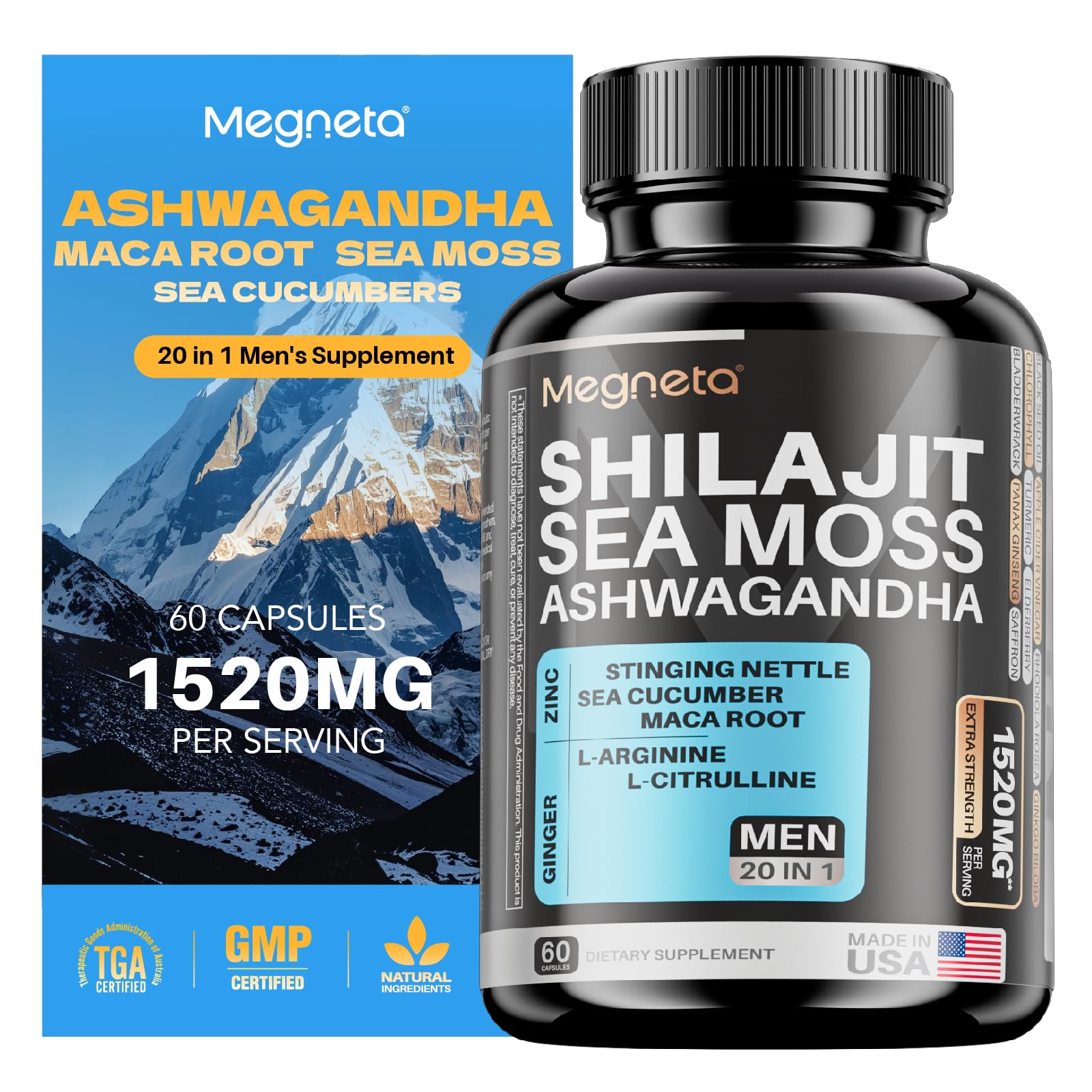 Easy to Use: Simply take 2 capsules daily to easily add essential nutrients to your routine. Our excellent customer service is here to support you— If there is any question about our products, please feel free to contact us. 100 Natural: 100 natural ingredients, vegan and made in USA. It's the clean, healthy choice for your wellness routine. Boost Energy: Unique formula helps men maintain high energy levels throughout the day, whether you're working out, working hard, or need extra vitality. It supports sustained energy, focus, keeping you active and ready for any challenge. Shilajit, Sea Moss Ashwagandha: With 200mg of Shilajit, 200mg of Sea Moss, and 100mg of Ashwagandha (30:1 Extract). Shilajit delivers essential minerals, antioxidants, and vitamins Sea Moss offers a nutrient-rich source Ashwagandha helps boost energy. Combined, they promote energy, immunity, and overall health. 20-IN-1: MEGNETA Shilajit supplement combines 20 powerful ingredients, including Shilajit, Sea Moss, Ashwagandha, L-Arginine, Ginger, Stinging Nettle, Apple Cider Vinegar, Elderberry, Bladderwrack, Ginkgo Biloba, Turmeric, Black Seed Oil, Saffron, and Rhodiola Rosea. This all-in-one formula is designed to support male energy, immunity and gut health for comprehensive wellness.