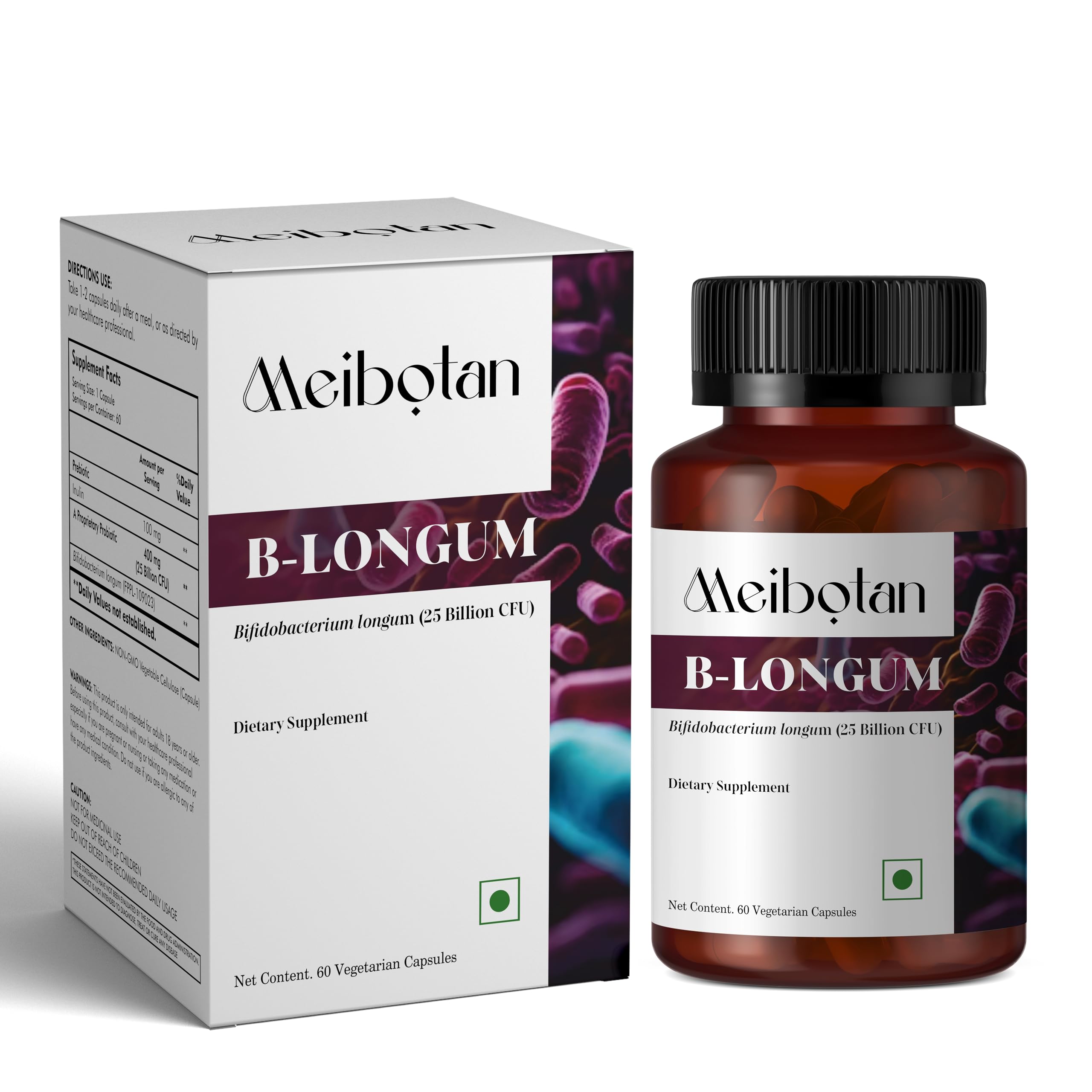 MEIBOTAN B-Longum Probiotic for Digestive and Immune Health Probiotics for Women & Men Helps Good Bacteria with Our Strain Bifidobacterium Longum 25 Billion - 60 Veggie Capsules