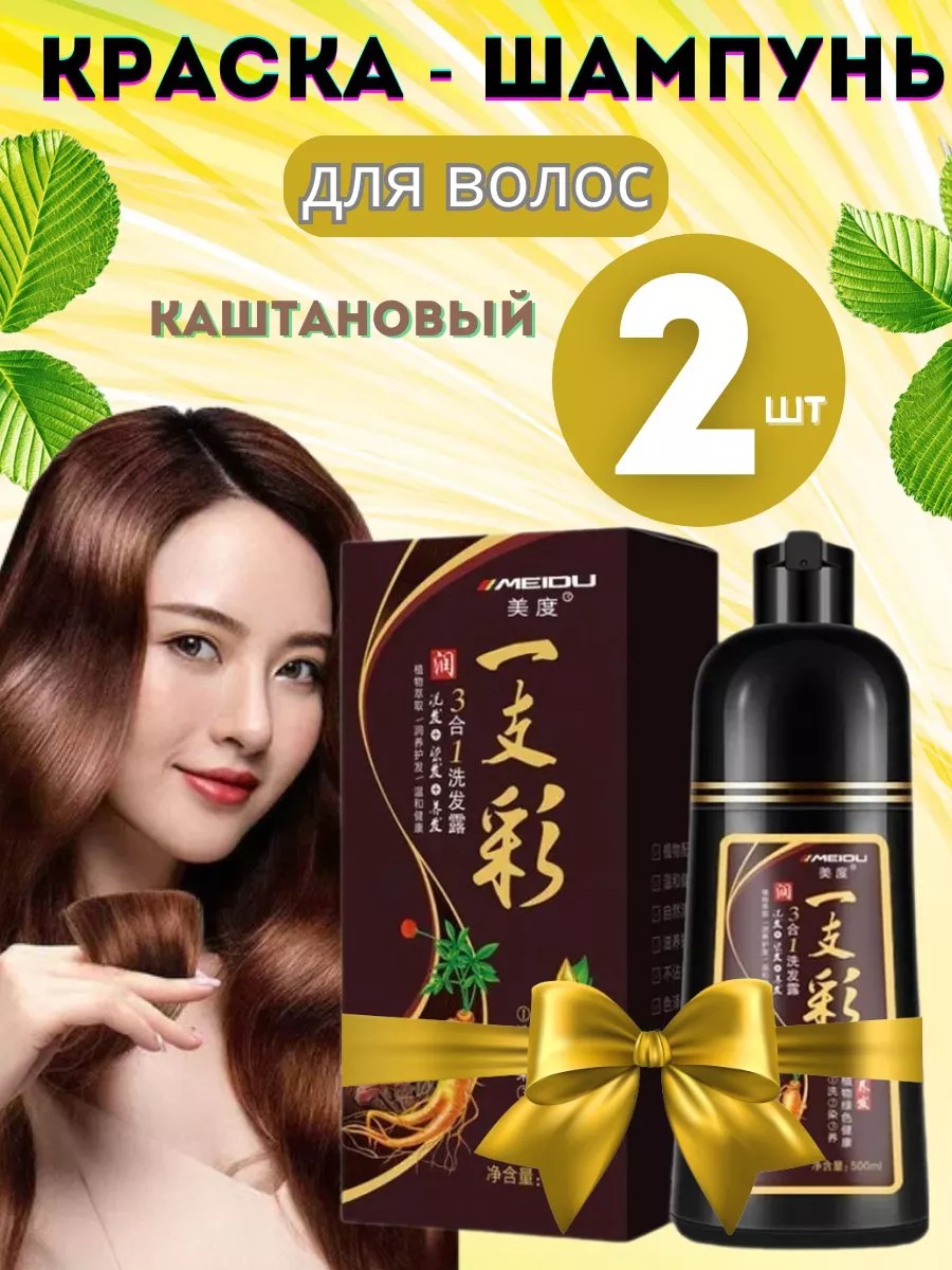 Ultra-fashionable CHESTNUT COLOR Are you looking for a gentle yet long-lasting hair color that's also easy to apply? Consider MEIDU's color-shampoo. Its unique formula uses natural ingredients and minimal chemicals. Therefore, the color is safe for hair and can be used by people with any skin and hair type. Whether you have normal, dry, or oily hair, this color-changing shampoo is suitable for everyone. It works equally well on straight and curly hair, long and short, as well as medium-length hair. This color was developed specifically for gray hair coverage, and it achieves 100% coverage. The pigment lasts up to 6 months on colored hair. It is suitable for covering root regrowth. This product will color dark, dark blond, medium blond, and bleached hair. It is equally suitable for brunettes and blondes. This dye is designed for scalp hair, but men can also use it to color their mustaches and beards. This tinted shampoo does not contain hydrogen peroxide and contains minimal ammonia. It contains only ingredients tested by Korean experts and suitable for modern cosmetics. This shampoo dye colors hair as gently as completely ammonia-free dyes. It is gentle and does not stain the skin. Thanks to ginseng root extract and vitamin complexes, the dye not only gives hair a vibrant shade but also conditions it. After toning, your hair will acquire a rich color and natural shine. The dye is very easy to use; the entire procedure will take no more than 15 minutes. We recommend performing a skin test before use. Then put on protective gloves. Squeeze the required amount of dye into your palm. Distribute it along the entire length of damp hair, from roots to ends. Massage for about 5 minutes to distribute the toner. Avoid contact with eyes. Rinse with water.