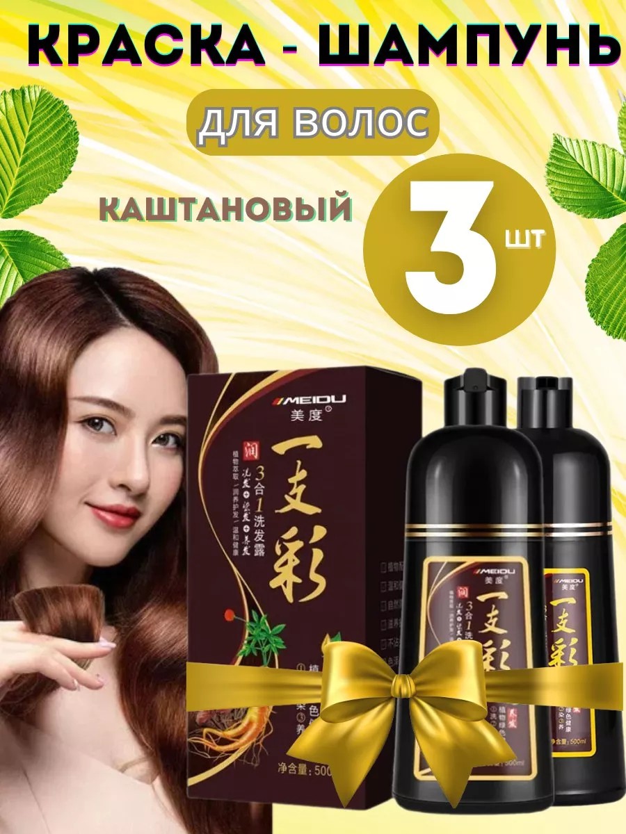 Ultra-fashionable CHESTNUT COLOR Are you looking for a gentle yet long-lasting hair color that's also easy to apply? Consider MEIDU's color-shampoo. Its unique formula uses natural ingredients and minimal chemicals. Therefore, the color is safe for hair and can be used by people with any skin and hair type. Whether you have normal, dry, or oily hair, this color-changing shampoo is suitable for everyone. It works equally well on straight and curly hair, long and short, as well as medium-length hair. This color was developed specifically for gray hair coverage, and it achieves 100% coverage. The pigment lasts up to 6 months on colored hair. It is suitable for covering root regrowth. This product will color dark, dark blond, medium blond, and bleached hair. It is equally suitable for brunettes and blondes. This dye is designed for scalp hair, but men can also use it to color their mustaches and beards. This tinted shampoo does not contain hydrogen peroxide and contains minimal ammonia. It contains only ingredients tested by Korean experts and suitable for modern cosmetics. This shampoo dye colors hair as gently as completely ammonia-free dyes. It is gentle and does not stain the skin. Thanks to ginseng root extract and vitamin complexes, the dye not only gives hair a vibrant shade but also conditions it. After toning, your hair will acquire a rich color and natural shine. The dye is very easy to use; the entire procedure will take no more than 15 minutes. We recommend performing a skin test before use. Then put on protective gloves. Squeeze the required amount of dye into your palm. Distribute it along the entire length of damp hair, from roots to ends. Massage for about 5 minutes to distribute the toner. Avoid contact with eyes. Rinse with water.