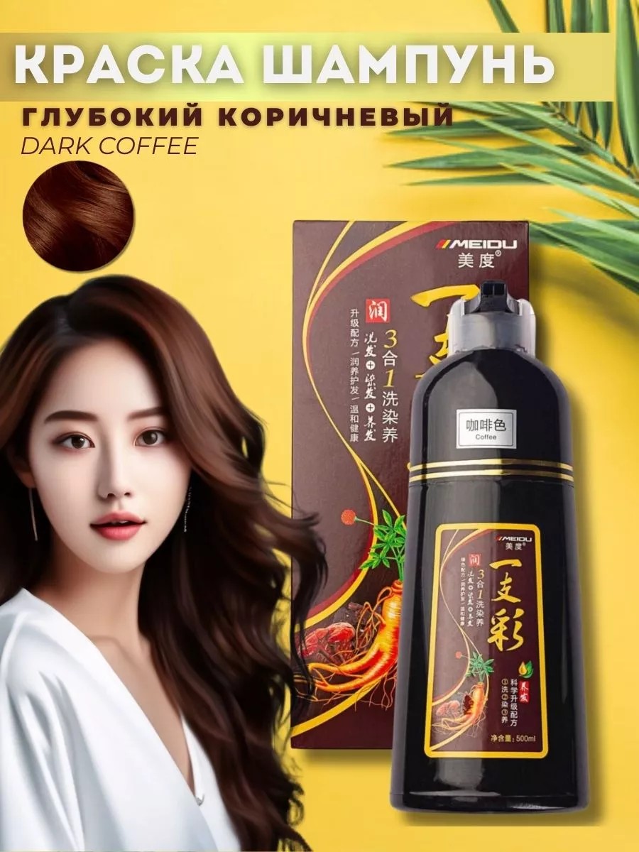 Tired of constantly coloring your hair? Meidu Professional Ginger 3-in-1 Shampoo is the latest generation of high-tech products for fast, safe, and natural hair coloring. This professional hair dye is suitable for both women and men for coloring their hair, beards, and mustaches. Its high-tech formula completely colors gray hair in 10-15 minutes. It leaves no residue on the skin. Unlike regular dyes, this hair dye has a pleasant scent of oils and ginger and is very easy to use. You can apply it to dry hair or slightly damp hair. Squeeze the desired amount of shampoo into your palms, mix well, and apply to your hair. Wait 10-15 minutes, and then rinse thoroughly. ECONOMICAL! One 500 ml package of shampoo lasts a year. Individual intolerance to certain ingredients is possible. Restore the fresh, youthful look of your hair! It's very convenient to color your hair at home and saves you precious time from salon visits. After washing, your hair will be shinier, softer, and smoother, ideal for preventing frizz and restoring hair from the root.