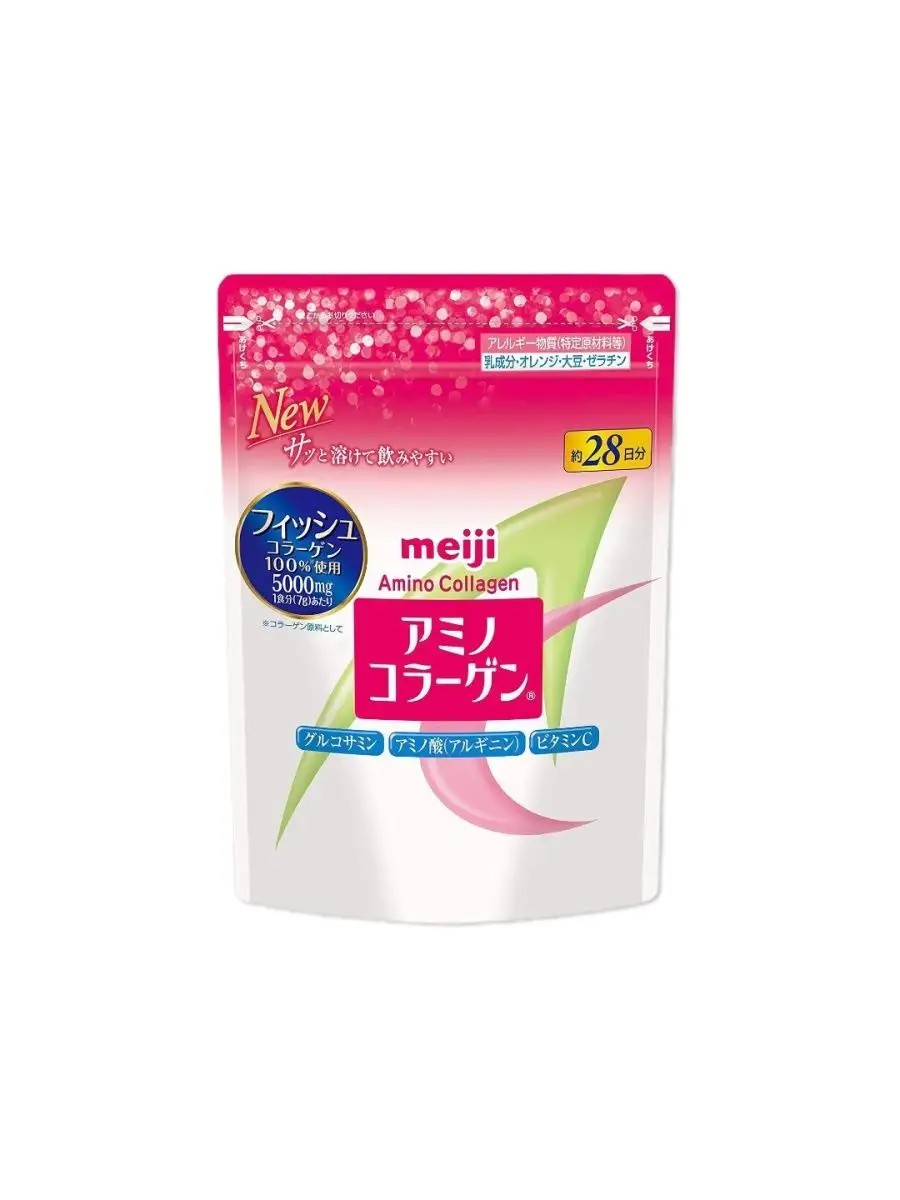 Самый популярный в мире коллаген от японского производителя Meiji. Этот порошкообразный коллаген содержит 5000 мг запатентованного высокоактивного Гидролизованный рыбного коллагена.Активные ингредиенты:✓ 63 мг церамиды . Церамиды нужны организму для придания емкости и сохранения влаги в коже. Так же они служат барьером против бактерий и загрязнений окружающей среды. Барьерная система кожи на 50% состоит из керамидов.✓ 500 мг аминокислот, таких как Аргинин способствует улучшению кровоснабжения органов таза и обеспечивает протекание информационных процессов в структурах мозга.✓ Глицин — улучшает метаболические процессы в тканях мозга, показан при нарушении мозгового кровообращения. Положительно влияет при мышечных дистрофиях. Уменьшает депрессивные нарушения, агрессию, повышенную раздражительность, нормализует сон.✓ Цистин — способствует детоксикации организма (после употребления алкоголя и курения или передозировок ацетаминофена), повышает спортивную выносливость.✓ 50 мг витамина С – помогает усваиваться коллагену и играет роль при создании собственного коллагена.✓ 60 мг глюкозамин — важный компонент опорно-двигательной системы. Он уменьшает воспаление и отечность суставов без каких-либо побочных явлений, играет важную роль в восстановлении соединительной и хрящевой тканей.Новая версия коллагена Meiji имеет более эффективные ингредиенты, за счет своего ускоренного растворения и переработки организмом.Продукт низкомолекулярный, гидролизованный и очищенный, вот главные секреты его усваиваемости. В составе только морской коллаген, который усваивается в полтора раза лучше свиного.Эффект от применения:— Заметное улучшение состояние кожи уже через месяц приема (упругость, тонус и гладкость, устранение морщин, нормализацию увлажненности);— Замедление процессов старения;— Улучшение роста волос, ногтей;— Улучшение гибкости суставов— проходит хруст в суставах. Уменьшается болевой синдром. Снимаются заболевания суставов— артрит, артроз, остеохондроз;— Ускоряется процесс восстановления после травм;— Укрепляется иммунная система;— Проходит синдром хронической усталости.Противопоказания: индивидуальная непереносимость и аллергия на компоненты препарата.
