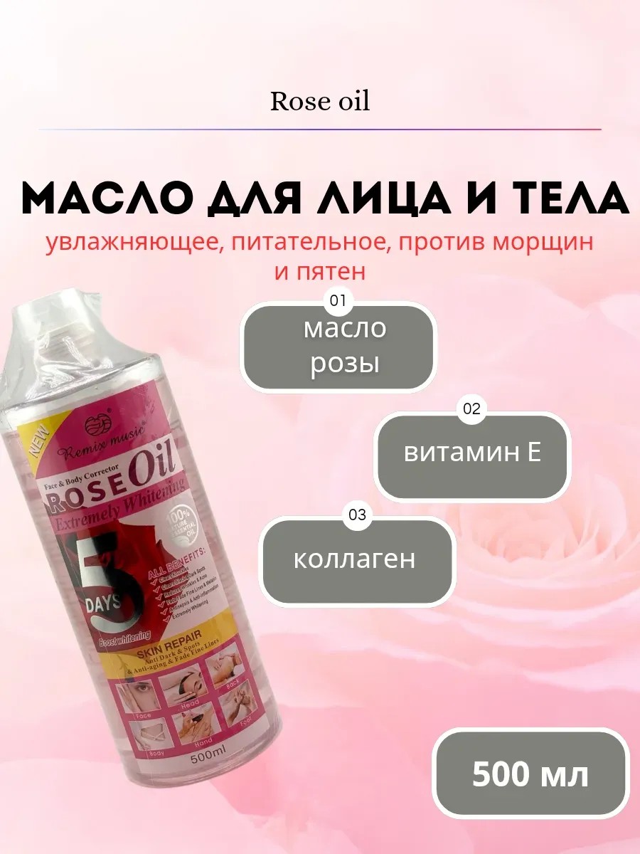 Remix Music Rose Oil (500 ml) is a natural cosmetic oil enriched with vitamin C, collagen, and plant oils.