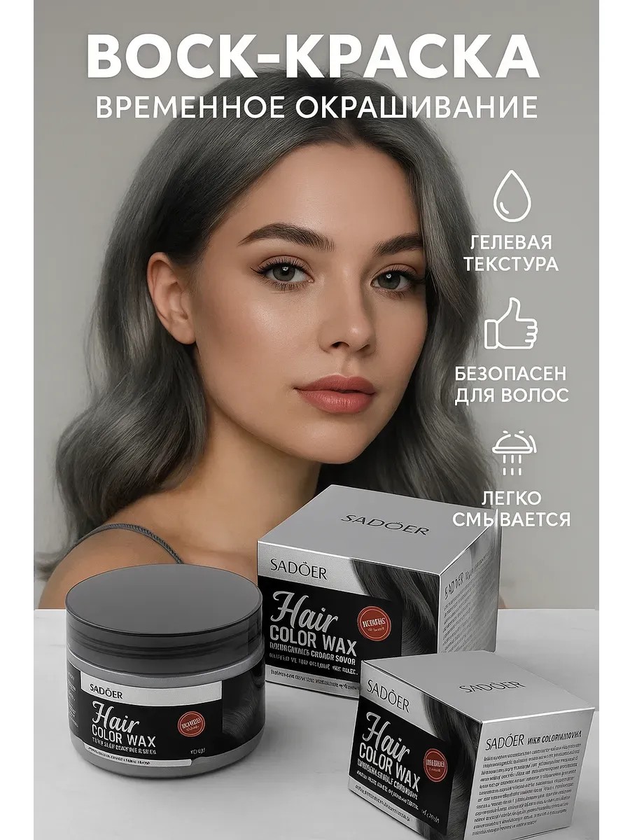 Временная краска-воск для волос SADOER (серый) — идеальное решение для тех, кто хочет кардинально изменить образ без вреда для волос. Этот инновационный продукт сочетает в себе функции краски и стайлингового средства, обеспечивая насыщенный цвет и легкую фиксацию укладки.
