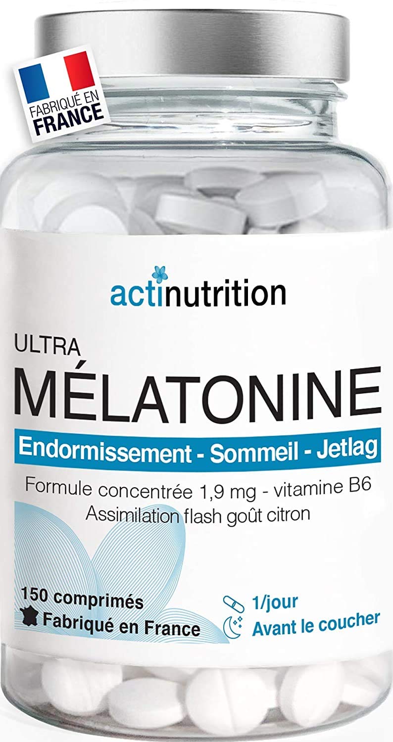 SATISFACTION GUARANTEED At Actinutrition, customer satisfaction is a priority value and even a reason for being. We are happy to answer your questions. Never hesitate to contact us: our team of nutritionists and experts, gathered around Dr. Yann Rougier, will be happy to talk with you and offer you adapted and immediate solutions. JUST WHAT YOU NEED Made in France, our formula synthesizes only the essential active ingredients. Vegan Gluten-free Gelatin-free Soy-free Lactose-free Wheat-free GMO-free Artificial coloring-free Dairy-free Yeast-free Preservative-free. THE LARGEST QUANTITY FOR 150 NIGHTS OF COMFORT Ultra Melatonin stands out for the best quality-quantity-price ratio in France. So think: 150 tablets per bottle is the equivalent of 5 months of quality sleep, or 150 peaceful and serene nights. Generosity is an important value for our entire team. ACTION ON ALL PHASES OF SLEEP An action on slow, deep and paradoxical sleep thanks to the unique combination of Melatonin 1.9 mg and vitamin B6 for rapid falling asleep and maintaining sleep throughout the night. THE HIGHEST DOSE OF MELATONIN 1.9 MG Ultra Melatonin from Actinutrition stands out for the highest concentration authorized in France, 1.9 mg per dose. It helps reduce the time it takes to fall asleep, is used against insomnia and helps alleviate the effects of jet lag.SATISFACTION GARANTIE Chez Actinutrition, la satisfaction du client est une valeur prioritaire et même une raison d'être. Nous prenons plaisir à répondre à vos questions. N'hésitez jamais à nous contacter : notre équipe de nutritionnistes et d'experts, réunie autour du Dr Yann Rougier, se fera un plaisir d'échanger avec vous et de vous offrir des solutions adaptées et immédiates. JUSTE LE NÉCESSAIRE Fabriquée en France, notre formule synthétise rien que les actifs essentiels. Vegan Sans gluten Sans gélatine Sans soja Sans lactose Sans blé Sans OGM Sans colorant artificiel Sans produit laitier Sans levure Sans conservateur. LA QUANTITÉ LA PLUS IMPORTANTE POUR 150 NUITS DE CONFORT Ultra Mélatonine se distingue par le meilleur rapport qualité-quantité-prix en France. Pensez donc : 150 comprimés par flacon, c'est l'équivalent de 5 mois de sommeil de qualité, soit 150 nuits tranquilles et sereines. La générosité est une valeur importante pour toute notre équipe. ACTION SUR TOUTES LES PHASES DU SOMMEIL Une action sur le sommeil lent, profond et paradoxal grâce à l'association unique de la Mélatonine 1,9mg et la vitamine B6 pour un endormissement rapide et un maintien du sommeil tout au long de la nuit. LA DOSE LA PLUS ÉLEVÉE DE MÉLATONINE 1,9 MG Ultra Mélatonine d'Actinutrition se distingue par la concentration la plus élevée autorisée en France, 1,9 mg par dose. Elle aide à réduire le temps d'endormissement, elle est utilisée contre l'insomnie et contribue à atténuer les effets du décalage horaire.