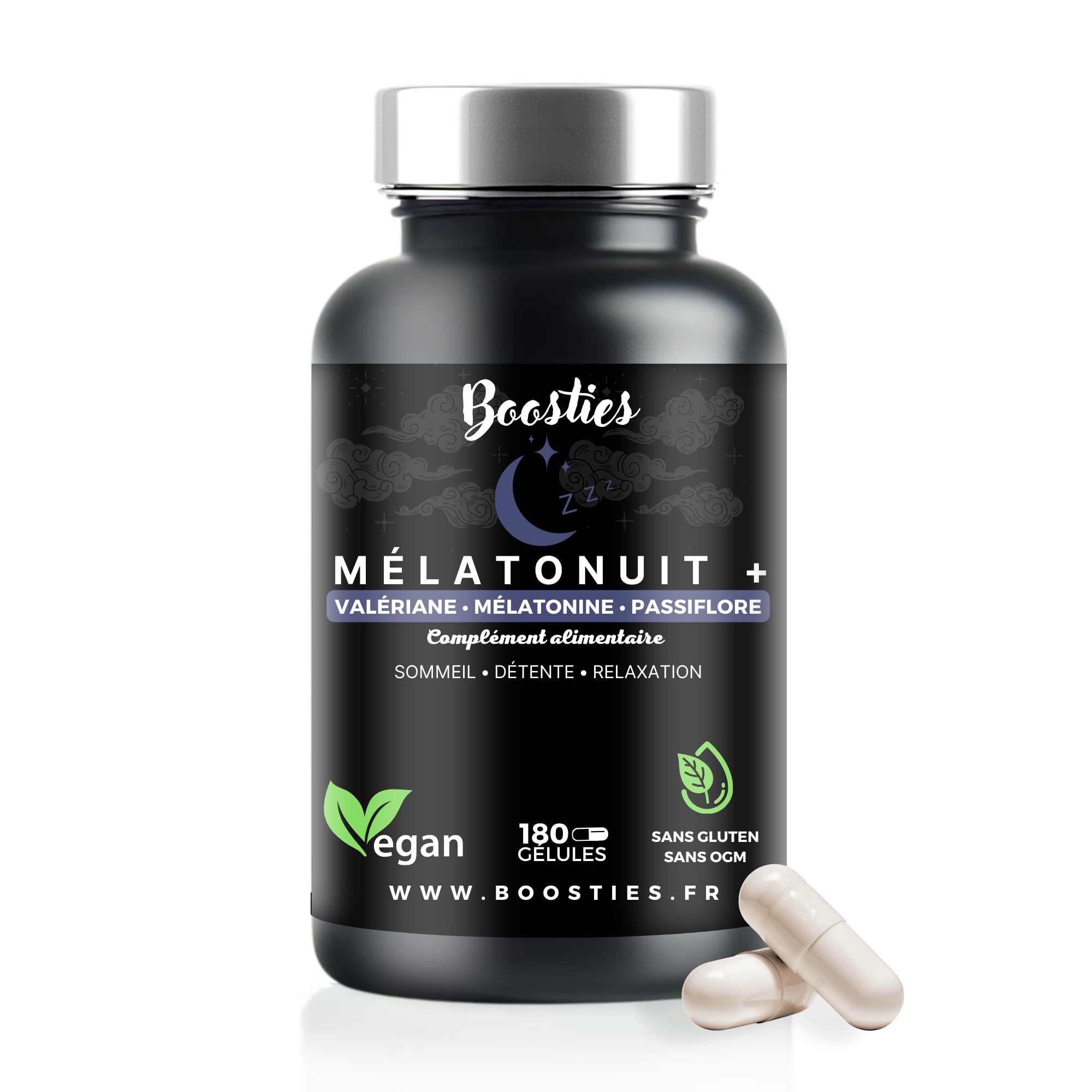 ✓ OUR GUARANTEES - Our capsules are made from a rigorous selection of high-quality ingredients. They are 100 healthy, GMO-free, and comply with the strictest quality standards. We strive daily to bring you the best value for money. Our customer service is available at any time for any questions or suggestions, do not hesitate to contact us. RESTFUL SLEEP TOTAL RELAXATION - An ideal formula for maximum effectiveness by combining the benefits of natural and soothing plants with the power of melatonin. Our formula has been specifically designed to offer you a relaxing and restful sleep. Ideal for people suffering from sleep disorders or jet lag. 5 ESSENTIAL PLANTS FOR YOUR SLEEP - Our formula is enriched with 5 essential plants. Valerian and Passionflower help fight insomnia and reduce anxiety and stress, Lemon Balm and Linden have long been used in traditional medicinal practices for their calming and relaxing properties. California Poppy promotes deep and restful sleep. 1.9MG OF PURE MELATONIN – Our formula contains 1.9mg per capsule, a high dose of pure melatonin. It is a key active ingredient in regulating the sleep-wake cycle. Melatonin helps regulate sleep cycles by promoting sleep onset and improving sleep quality. It can be beneficial for people suffering from insomnia, jet lag or sleep disorders related to disrupted circadian rhythms. BOOST YOUR SLEEP – Dive into restful sleep and restore the natural balance of your nights with Mélaniut . Our dietary supplement offers you a unique formula, combining 1.9 mg of pure melatonin and a selection of 5 soothing plants such as valerian, linden, California poppy, lemon balm and passionflower.✓ NOS GARANTIES- Nos gélules sont élaborés à partir d'une sélection rigoureusement d'ingrédients de qualité supérieure. Ils sont 100 sain pour la santé, sans OGM en respectant les normes de qualité les plus strictes.Nous s'efforçons quotidiennement de vous apporter le meilleur rapport qualité prix. Notre service client est à votre écoute à tout moment pour toutes questions ou suggestions, n'hésitez pas à nous contacter. SOMMEIL RÉPARATEUR RELAXATION TOTALE – Une formule idéale pour une efficacité maximale en combinant les bienfaits des plantes naturelles et apaisantes avec la puissance de la mélatonine. Notre formule a été spécifiquement conçue pour vous offrir un sommeil relaxant et réparateur. Idéal pour les personnes souffrant de troubles du sommeil, ou de décalage horaire. 5 PLANTES ESSENTIELLES POUR VOTRE SOMMEIL – Notre formule est enrichie de 5 plantes essentielles. La valériane et la Passiflore aident à lutter contre l'insomnie et réduire l'anxiété et le stress, la mélisse et le tilleul sont utilisés depuis longtemps dans les pratiques médicinales traditionnelles pour leurs propriétés calmantes et relaxantes. Le pavot de Californie favorise un sommeil profond et réparateur. 1,9MG DE MÉLATONINE PUR – Notre formule contient 1,9mg par gélule, une forte dose de mélatonine pure. C'est un actif clé pour réguler le cycle veille-sommeil. La mélatonine aide à réguler les cycles de sommeil en favorisant l'endormissement et en améliorant la qualité du sommeil. Elle peut être bénéfique pour les personnes souffrant d'insomnie, de décalage horaire ou de troubles du sommeil liés aux rythmes circadiens perturbés. BOOSTER VOTRE SOMMEIL – Plongez dans un sommeil réparateur et retrouvez l'équilibre naturel de vos nuits avec Mélaniut . Notre complément alimentaire vous offre une formule unique, combinant 1,9 mg de mélatonine pur et une sélection 5 plantes apaisantes telles que la valériane, le tilleul, le pavot de Californie, la mélisse et la passiflore.