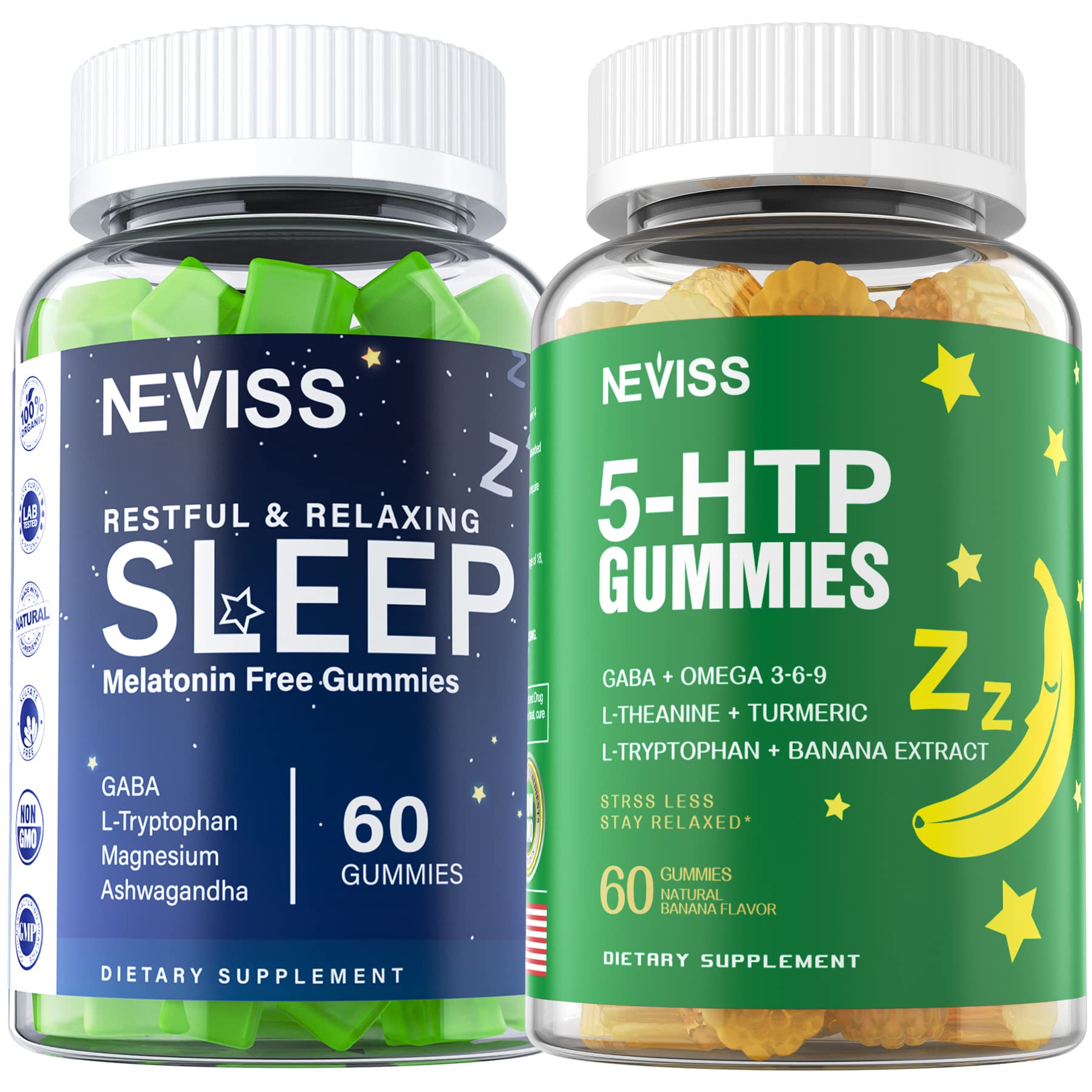 Wake up fresh Non-Habit Forming - For who difficult to wake up fresh and energized in the morning. Sleep gummies without melatonin help support a better sleep habits and energetic in the morning. These gummies chewables are non habit forming. Stay Calm Focus: Relaxation gummies is the safest option among calm supplements for those who need improve mood and stress to aid in natural relaxation and calming. Promote needed support for brain work- sustain focus and augment memory, which is highly important these days. Unique Powerful Formula: 5 htp calm gummies are packed with NEVISS Utopia Blend - GABA, L theanine, Omega-3-6-9, Turmeric to further boost their potency to help you get your sweet rest, boost immune system, maintains a balanced mood while resting aids, boost energy and overall health to start your day for men and women. Promote Reaceful Rest: Wake up in the middle of the night? Stressful, irregular schedules and difficult to enter the rest? Our 5-HTP gummies with proprietary banana extract to help improve your rest cycles. Combines L-Tryptophan, which can increase the concentration of serotonin in the brain and promote the formation of melatonin. General fatigue relief and support relaxation at night help you wake up refreshed. (Please do not operate machinery or drive after taking this 5 htp calm gummies.). Sleep Gummies No Melatonin for Adults : Promote relaxation and sleep with these sleep gummies no melatonin formulated for adults! This gummies won't leave you feeling drowsy or groggy in the morning. Get back to normal sleep, wake up refreshed without lingering drowsiness.
