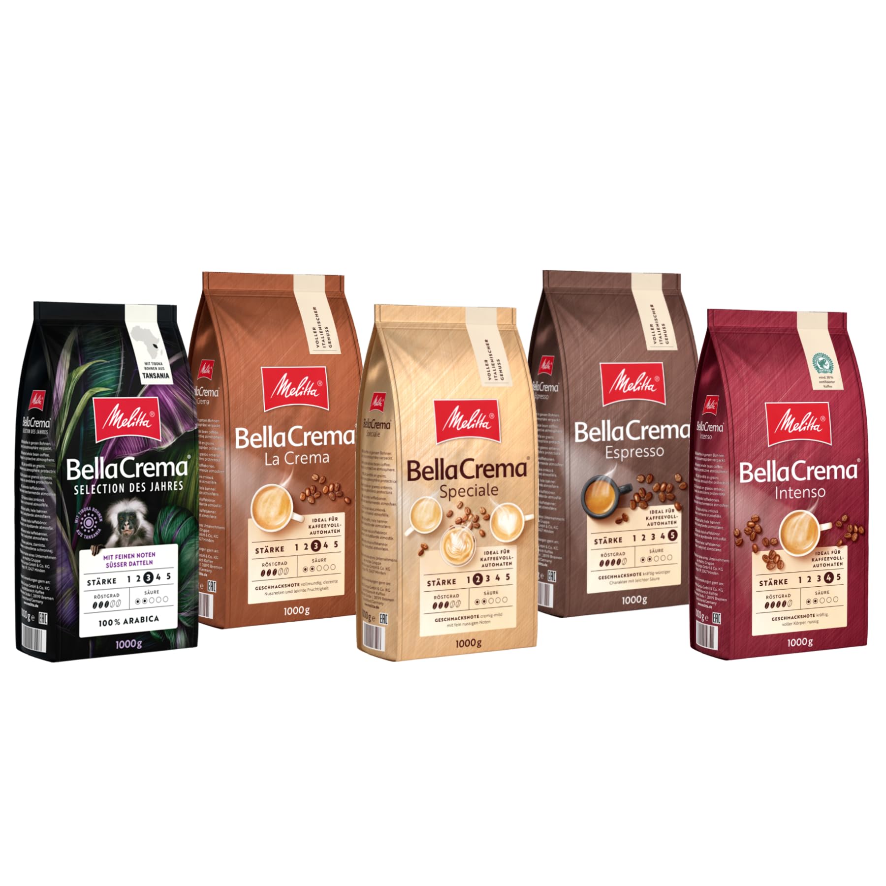 DELIVERY CONTENTS: The BellaCrema sample pack consists of 1 x 1 kg La Crema, 1 x 1 kg Speciale, 1 x 1 kg Espresso, 1 x 1 kg Intenso, 1 x 1 kg Selection of the Year. IDEAL FOR FULLY AUTOMATIC COFFEE MACHINES: The coffee beans can be prepared in fully automatic machines or ground for manual filtration, portafilter, espresso maker or French press. PERFECT ROASTING: Thanks to the perfect roasting time up to the second crack, which is individually adjusted for each coffee roasting process, more than 800 aromas are created for the best taste. AROMA PACKAGING: The vacuum packaging seals all the coffee aromas and there is no loss of taste during the entire shelf life. ROASTED IN GERMANY: Roasted in Germany to the highest quality standards and testing.ROASTED IN GERMANY: Roasted in Germany according to the highest quality standards and tests. PACKED FLAVOR: Vacuum-packed, all aromas are sealed in the coffee and there is no loss of flavor during the entire shelf life. PERFECT ROASTING: Thanks to the perfect roasting time until the second crack, which is individually adjusted to each coffee roasting process, more than 800 aromas are created for the best taste. IDEAL FOR FULLY AUTOMATIC COFFEE MACHINES: The coffee beans are suitable for preparation in fully automatic machines or ground for manual filtration, portafilter, espresso maker or French press. DELIVERY CONTENTS: The BellaCrema sample box includes 1x 1 kg La Crema, 1x 1 kg Speciale, 1x 1 kg Espresso, 1x 1 kg Intenso, 1x 1 kg Selection of the Year. CONTENU DE LA LIVRAISON : Le pack d'échantillons BellaCrema se compose de 1x 1 kg de La Crema, 1x 1 kg de Speciale, 1x 1 kg d'Espresso, 1x 1 kg d'Intenso, 1x 1 kg de Sélection de l'année. IDÉAL POUR LES MACHINES À CAFÉ ENTIÈREMENT AUTOMATIQUES : Les grains de café peuvent être préparés dans des machines entièrement automatiques ou moulus pour la filtration manuelle, le porte-filtre, la cafetière à expresso ou la presse française. TORRÉFACTION PARFAITE : Grâce au temps de torréfaction parfait jusqu'au deuxième craquement, qui est ajusté individuellement pour chaque processus de torréfaction du café, plus de 800 arômes sont créés pour le meilleur goût. EMBALLAGE ARÔME : L'emballage sous vide scelle tous les arômes du café et il n'y a aucune perte de goût pendant toute la durée de conservation. TORRÉFACTION EN ALLEMAGNE : Torréfié en Allemagne selon les normes et tests de qualité les plus élevés.TORRÉFIÉ EN ALLEMAGNE : Torréfié en Allemagne selon les normes et tests de qualité les plus élevés. ARÔME EMBALLÉ : Emballé sous vide, tous les arômes sont scellés dans le café et il n'y a aucune perte de saveur pendant toute la durée de conservation. TORRÉFACTION PARFAITE : Grâce au temps de torréfaction parfait jusqu'à la deuxième fissure, qui est ajusté individuellement à chaque processus de torréfaction du café, plus de 800 arômes sont créés pour le meilleur goût. IDÉAL POUR LES MACHINES À CAFÉ ENTIÈREMENT AUTOMATIQUES : Les grains de café conviennent à la préparation dans des machines entièrement automatiques ou moulus pour la filtration manuelle, le porte-filtre, la cafetière expresso ou la presse française. CONTENU DE LA LIVRAISON : Le coffret d'échantillons BellaCrema comprend 1x 1 kg La Crema, 1x 1 kg Speciale, 1x 1 kg Espresso, 1x 1 kg Intenso, 1x 1 kg Sélection de l'année.