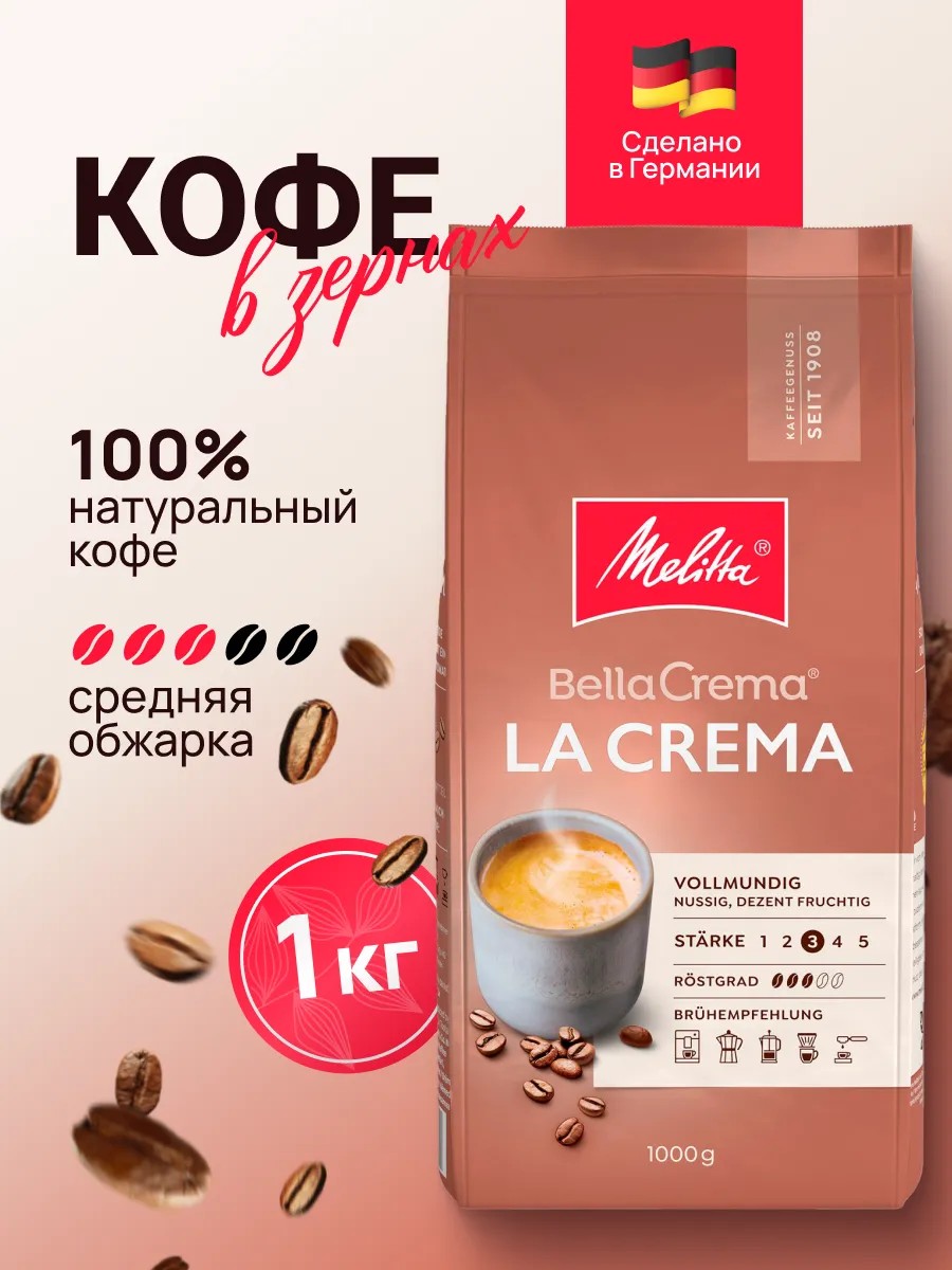 Кофе в зернах Melitta Bella Crema la Crema бленд арабики и робусты 1 кг - это сложный и идеально сбалансированный состав из великолепной арабики, которую тщательно отбирают и выверяют специалисты немецкой компании. Средняя равномерная обжарка подчеркивает насыщенный вкус и роскошную консистенцию готового напитка.
