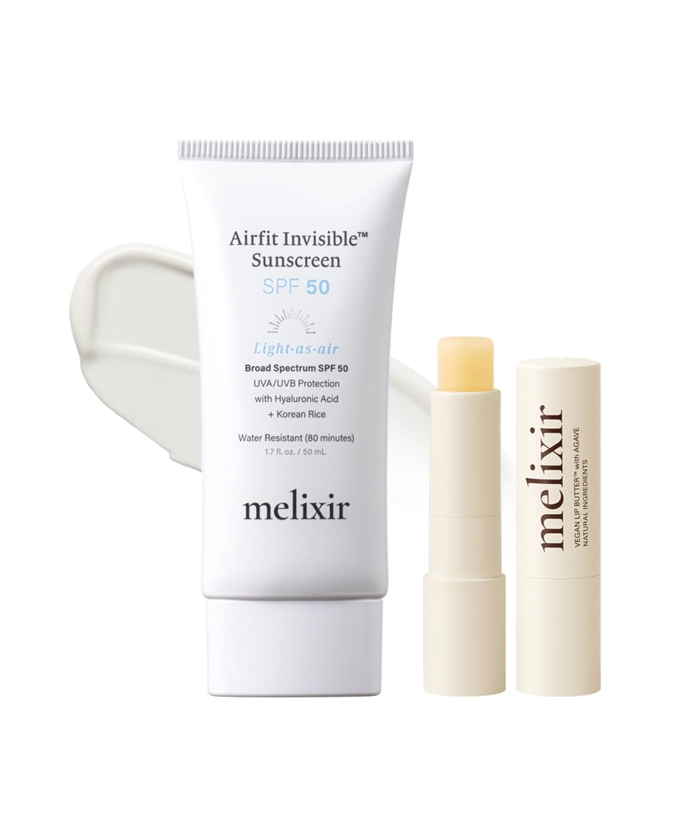Melixir Best Seller Duo: Airfit Invisible Sunscreen Vegan Lip Butter 01 Agave(Clear) – Your go-to essentials for daily hydration and protection, this bestselling duo pairs our cult-favorite invisible sunscreen with our ultra-nourishing vegan lip butter—both designed with sensitive skin in mind. Airfit Invisible Sunscreen SPF 50: A lightweight, non-sticky sunscreen that delivers broad spectrum SPF 50 protection with a natural, clear finish—no white cast on any skin tone. Powered by Korean rice and hyaluronic acid, it hydrates while shielding your skin from UV rays. This clean chemical formula is dermatologist-approved, sweat- and water-resistant for up to 80 minutes, and free from parabens and oxybenzone. Ideal for daily wear and outdoor activities, it doubles as a hydrating moisturizer with SPF. Vegan Lip Butter 01 Agave: Hydrate and soften dry lips with this silky, plant-based lip balm. Infused with agave, shea butter, and five nourishing plant oils, it delivers deep moisture without stickiness. The sheer, buildable tint gives a healthy, natural glow—perfect for on-the-go touch-ups. Clinically tested for sensitive lips, it's 100 vegan, cruelty-free, and free of harmful chemicals.[About Melixir ] Melixir creates plant-based skincare products rooted in Korean wellness culture. Inspired by the power of medicinal herbs in Asia, we create high-quality products that are effective for sensitive skin. Certified B Corporation. [Moisturizing Lip Care] A silky, non-sticky lip butter that glides smoothly onto lips for instant hydration and shine. Travel-friendly and compact, it keeps lips soft, moisturized, and glowing wherever you go. [Dermatologists' Approved] This SPF moisturizer is dermatologically approved to be gentle on sensitive skin and free from eye irritation. Additionally, it meets UV filter regulations for OTC products, ensuring its safety for everyday use. [Invisible SPF 50 Sunscreen] A broad-spectrum facial sunscreen that absorbs easily and leaves a natural finish with no white cast. Infused with Korean rice and hyaluronic acid, it delivers deep hydration and serves as the perfect 2-in-1 solution for daily moisturizing and sun protection. [Best-Selling Daily Essentials?] Discover Melixir's best-selling duo for ultimate hydration and protection. The Airfit Invisible Sunscreen provides lightweight, broad-spectrum SPF 50 defense with a hydrating, natural finish, while the Vegan Lip Butter nourishes and softens lips with agave and shea butter.