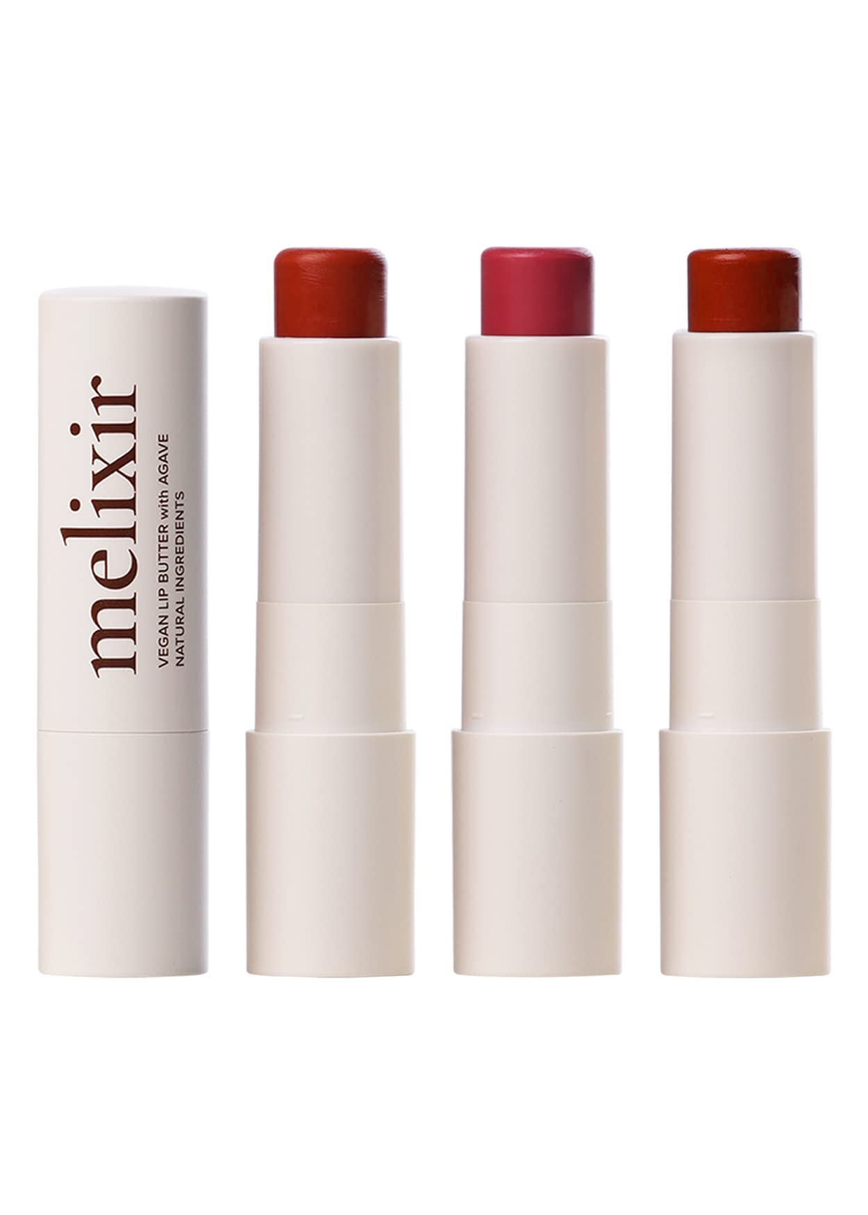 [Clean Vegan ] A skin-friendly formula, free from harmful chemicals. This lip butter is 100 vegan, cruelty-free, and clinically tested to cause no irritation on sensitive lips. - [About Melixir ] Melixir creates plant-based skincare products rooted in Korean wellness culture. Inspired by the power of medicinal herbs in Asia, we create high-quality products that are effective for sensitive skin. Certified B Corporation. [Sheer, Buildable Color ] A single swipe of this lip balm adds a hint of sheer tint for a perfect no-makeup look. Layer for a deeper shade. [Powered by Agave Shea Butter ] We use agave instead of petroleum jelly and blend it with ultra-hydrating shea butter. Combined with 5 plant-based oil and vitamin E, this vegan formula nourishes, soothes, and protects dry, chapped lips. [Moisturizing Daily Lip Care? ] This silky, non-sticky Vegan Lip Butter glides on smoothly for instant hydration and shine. Compact and travel-friendly, it keeps your lips soft, moisturized, and naturally glowing wherever you go. [Our Most-Loved Shades Together? ] Discover our best-selling shades— 03 Red Velvet, 05 Dewy Rose, and 06 Rust Red—for everyday color and care.