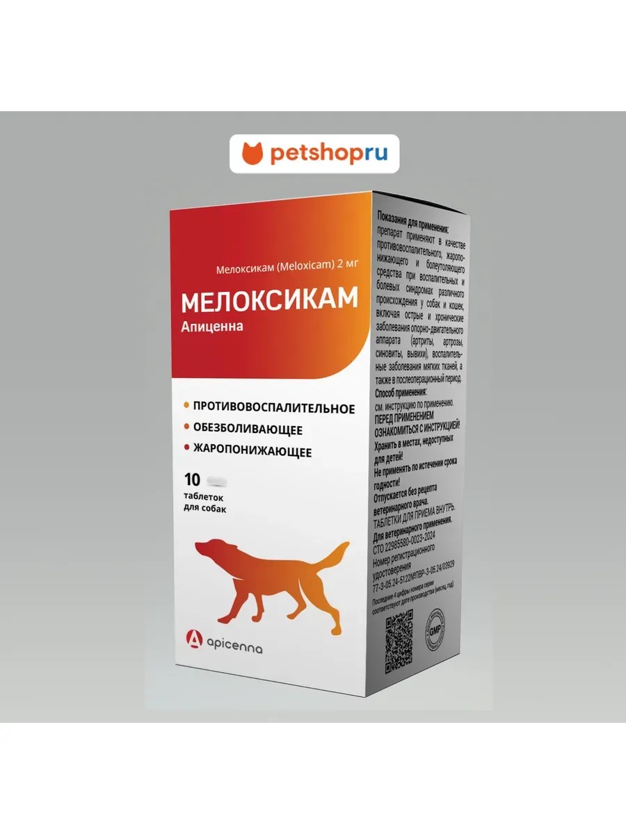 Полное наименование товараApicenna Мелоксикам Апиценна 2,0 мг для собак, 10 таблеток по 240 мг
