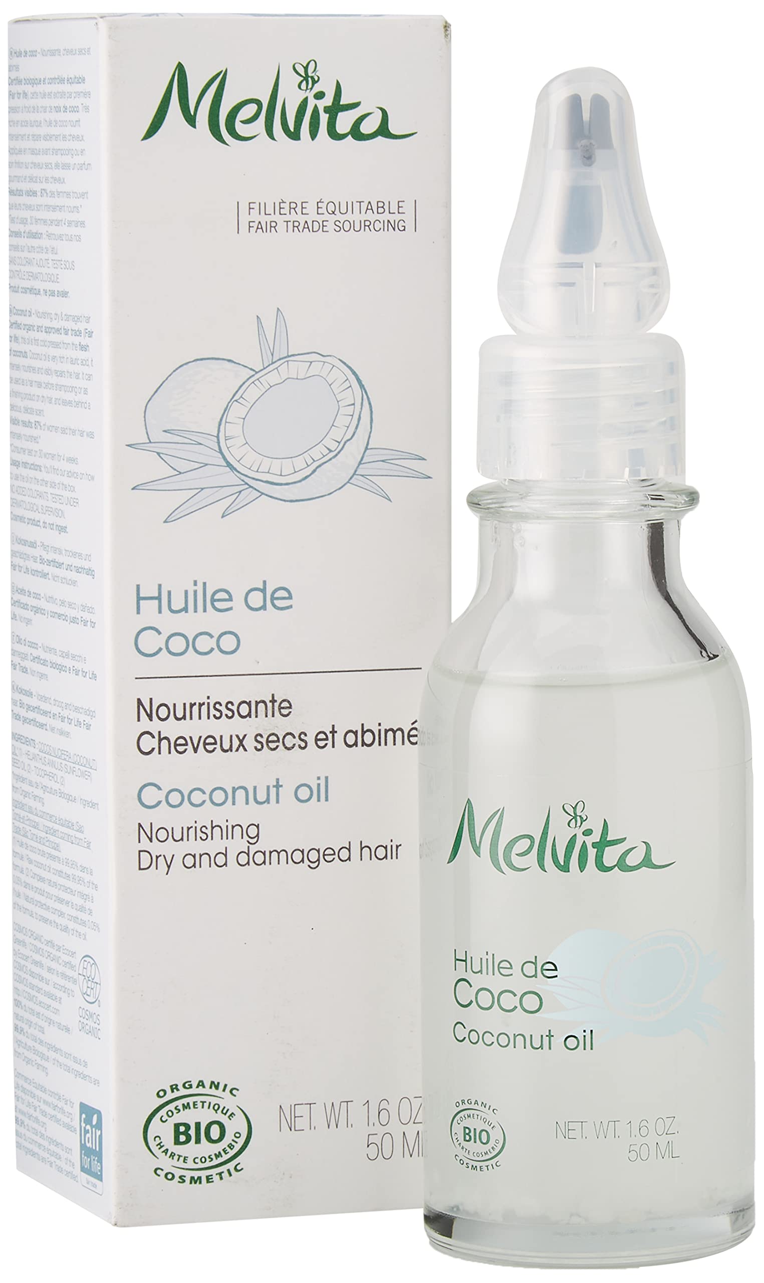 An oil structure.For dry and damaged hair.Organic -certified, of course at 100% and fairly controlled, coconut oil melvita will quickly add them.It nourishes intensely and repairs the hair while leaving a pleasant charming perfume.100% recyclable bottle and revolutionary drop -to -trop applicator.Give the bottle under hot water to get the oil texture.In mask in front of shampoo or in night care on dry hair for shampoo.It nourishes intensely and repairs the driest and damaged hair for enriched and silky hair.