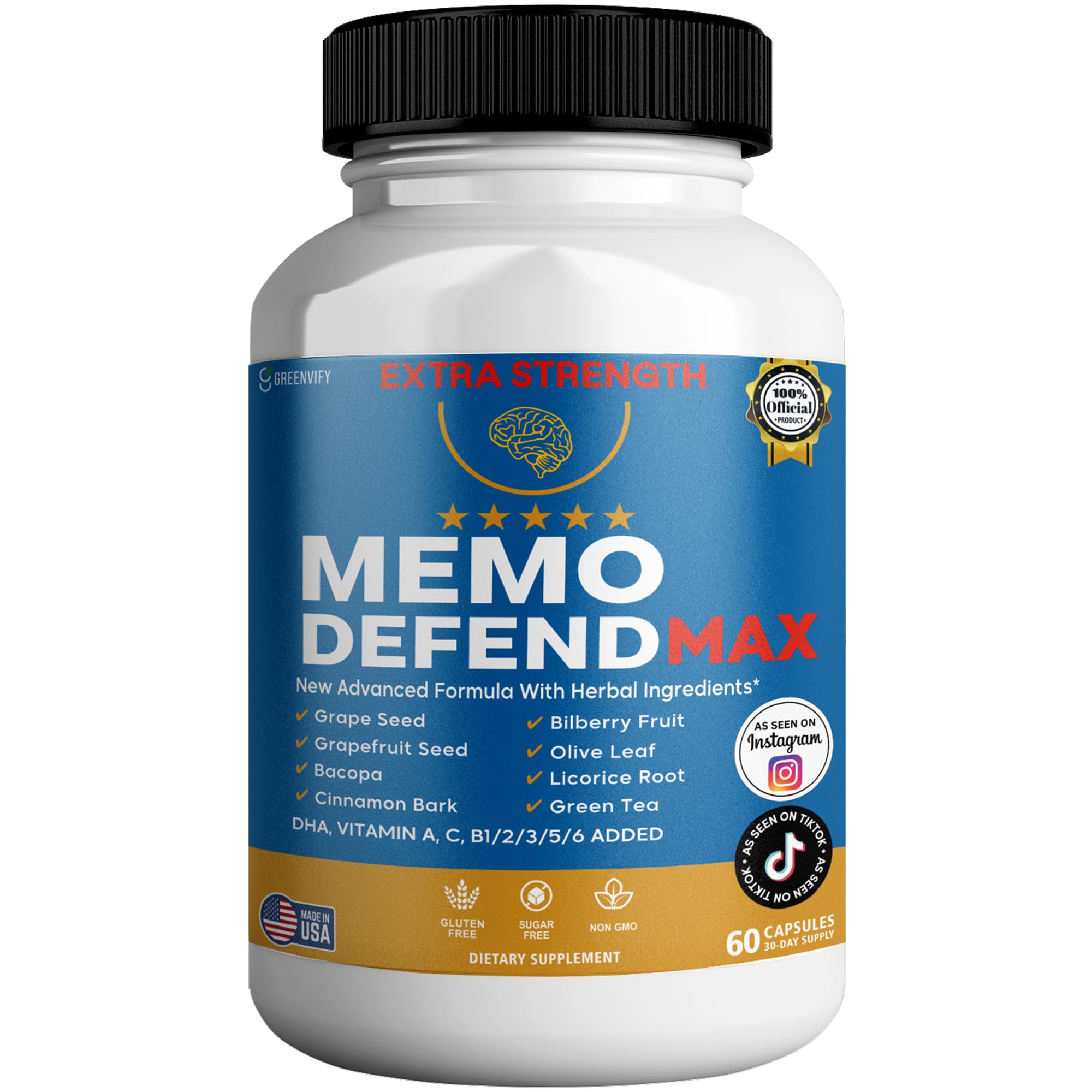Memo Defend Max Memory Support Supplement 60 Capsules with Vitamins A C D E B Complex DHA Bacopa Grapefruit Seed (1)