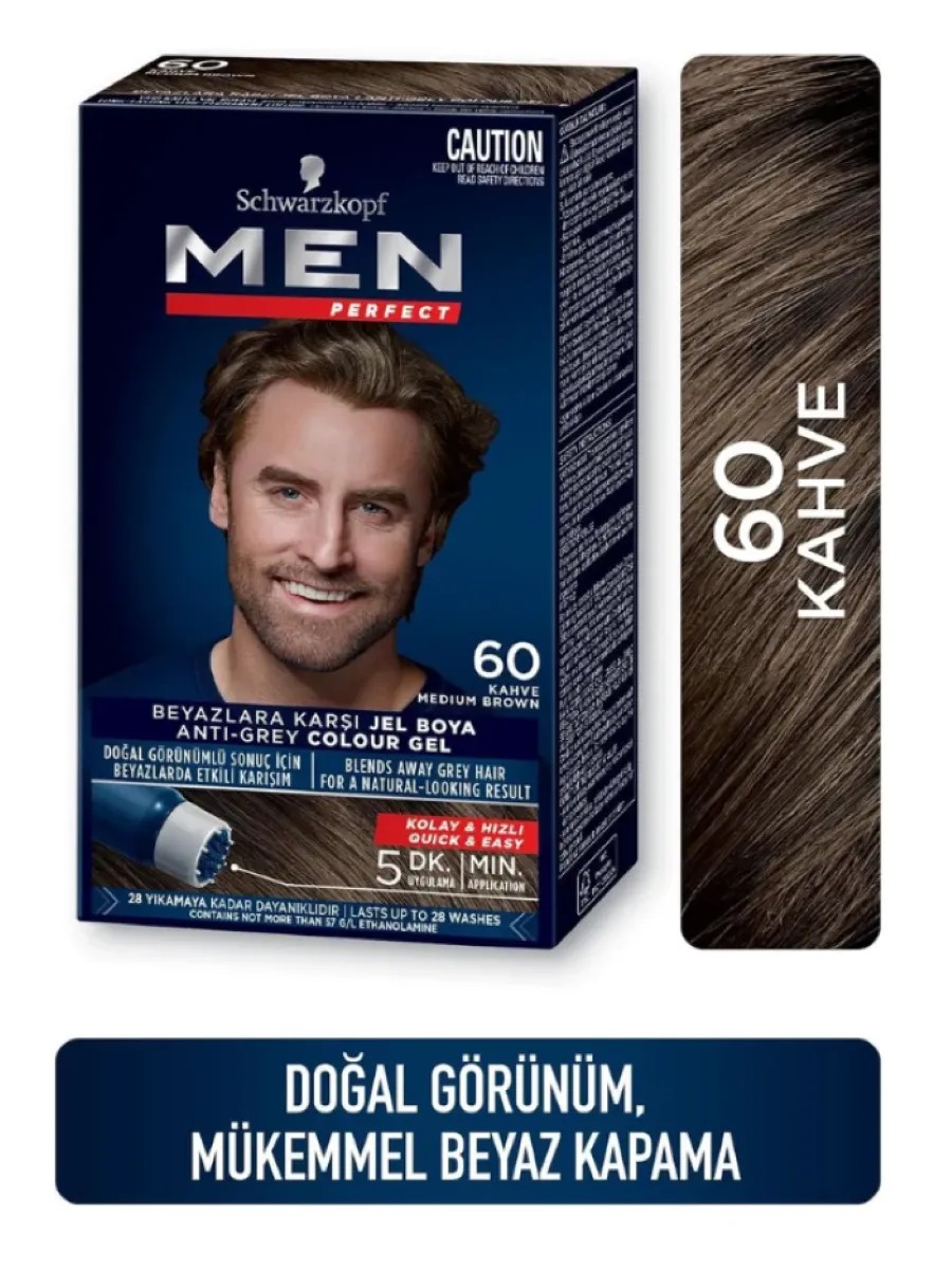 Schwarzkopf Men Perfect 60 Natural Medium Brown Toning Hair Gel, Anti-Gray, 80 ml. A toning gel against gray hair developed specifically for men, Schwarzkopf Men Perfect gently tones and gives hair a natural shade without gray hair. Lasts on hair up to 28 washes. The patented, convenient, quick-release applicator makes Schwarzkopf Men Perfect incredibly easy to use, allowing you to quickly and easily eliminate gray hair.