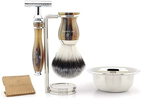 Get a more thorough, smoother and easier shave by having all the important shaving tools available. Our Double Edge razor offers you the best clean and professional shave as a razor as well as electric razors and trimmers. It is durable.You just have to replace the cartridge. A perfect gift set for your son, father, husband and friends for New Year, birthday, Christmas and various occasions. Please note: Due to the nature of the material, each article is unique and the color/pattern of the handle may differ from the above illustrations.The bowl is made of stainless steel, which is a great companion for the brush to get a large amount of foam.A heavier, stable and durable stand captures the razor and the brush to prevent falling.It has a strong grip and lets the razor and the brush dry quickly.The stand and the shell are made of high -quality stainless steel with chrome -plated material.The grip of the shaving brush consists of resin in a brownish color to ensure the best balance, stylish appearance, comfort and lightness.The high -quality synthetic hair can absorb a lot of water and creates a thick foam for thorough and clean shaving.The grip of the razor consists of resin, making you have a high -quality feeling in your hand.This shaving set from Jagshaving consists of twin -edged blade, shaving brush, shaving bowl and stand for razors and brushes in an elegant box. Erhalten Sie eine gründlichere, glattere und einfachere Rasur, indem Sie alle wichtigen Rasierwerkzeuge zur Verfügung haben. Unser Double Edge Rasierer bietet Ihnen die beste saubere und professionelle Rasur als ein Rasiermesser sowie elektrische Rasierer und Trimmer. Es ist langlebig. Sie müssen nur die Patrone ersetzen. Ein perfektes Geschenkset für Ihren Sohn, Vater, Ehemann und Freunde zu Neujahr, Geburtstag, Weihnachten und verschiedenen Anlässen. Bitte beachten Sie: Aufgrund der Beschaffenheit des Materials ist jeder Artikel ein Unikat und die Farbe/das Muster des Griffs kann von den obigen Abbildungen abweichen.Die Schüssel besteht aus Edelstahl, der ein großartiger Begleiter für die Bürste ist, um eine große Menge Schaum zu erhalten. Ein schwererer, stabiler und langlebiger Ständer hält den Rasierer und die Bürste fest, um ein Herunterfallen zu verhindern. Es hat einen starken Griff und lässt den Rasierer und die Bürste schnell trocknen. Der Ständer und die Schale sind aus hochwertigem Edelstahl mit verchromtem Material gefertigt. Der Griff des Rasierpinsels besteht aus Harz in bräunlicher Farbe, um die beste Balance, stilvolles Aussehen, Komfort und Leichtigkeit zu gewährleisten. Das hochwertige Kunsthaar kann viel Wasser aufnehmen und erzeugt einen dicken Schaum für eine gründliche und saubere Rasur. Der Griff des Rasiermessers besteht aus Harz, wodurch Sie ein hochwertiges Gefühl in der Hand haben. Dieses Rasierset von JAGShaving besteht aus zweischneidiger Klinge, Rasierpinsel, Rasierschale und Ständer für Rasierer und Pinsel in einer eleganten Box.Herren Double Edge Razor Rasierpinselständer aus Kunsthaar und Rasierschale Rasierset – Elegantes Rasierpinselset von Jag Shaving