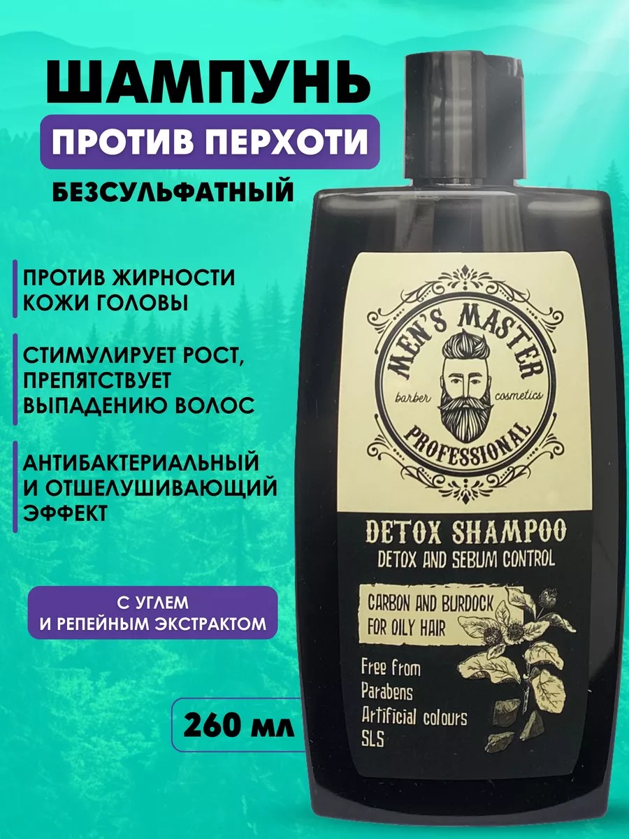 MEN'S MASTER Очищающий шампунь для мужчин против перхоти I Детокс I Для жирных волос у корней, с углем и экстрактом лопуха для глубокого очищения, 260 мл - это профессиональное средство для ухода за волосами, которое обеспечивает глубокую очистку, увлажнение, укрепление и защиту от негативного воздействия окружающей среды.