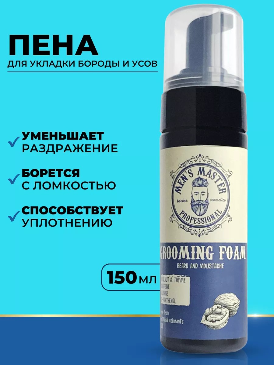 Увлажняющая пена MEN’S MASTER для бороды и усов. Интенсивно увлажняет бороду и усы. Входящие в состав экстракты чабреца, ореха, крапива и D-пантенол уменьшают зуд, шелушения и покраснения кожи. Хинин и кофеин стимулируют естественный рост волосков, восстанавливают их жизненную силу и способствуют уплотнению бороды и усов. Подходит для применения после бритья. Способ применения: в зависимости от длины и густоты вашей бороды, небольшое количество пены ( от 2 до 4 нажатий) равномерно нанесите на вымытые и подсушенные полотенцем бороду и усы. Вотрите в кожу под щетиной для питания и увлажнения.